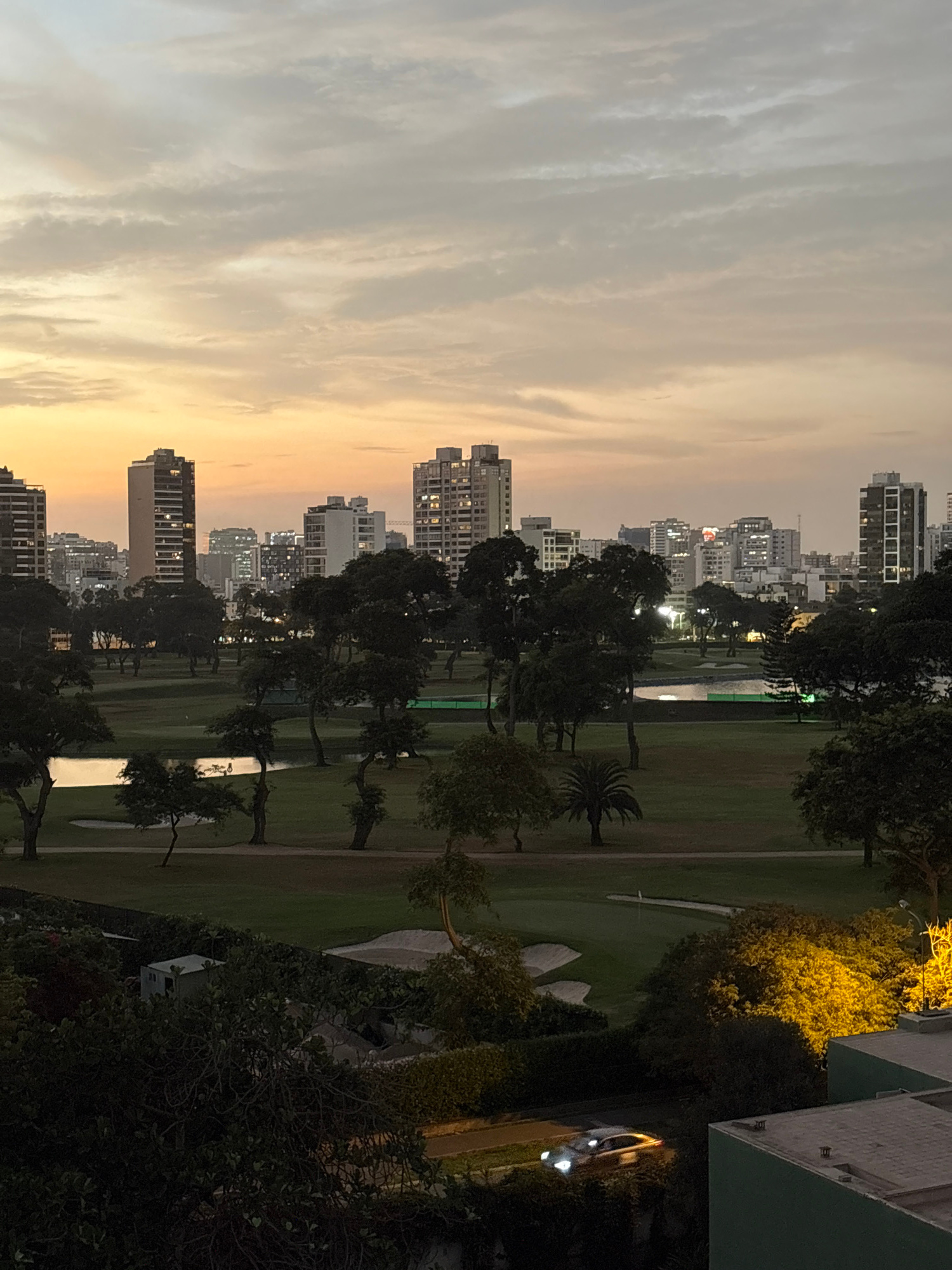 The image depicts a cityscape scene at dusk, likely taken from an elevated position. In the background, there is a skyline of buildings, primarily high-rise apartments, illuminated by artificial light…read more