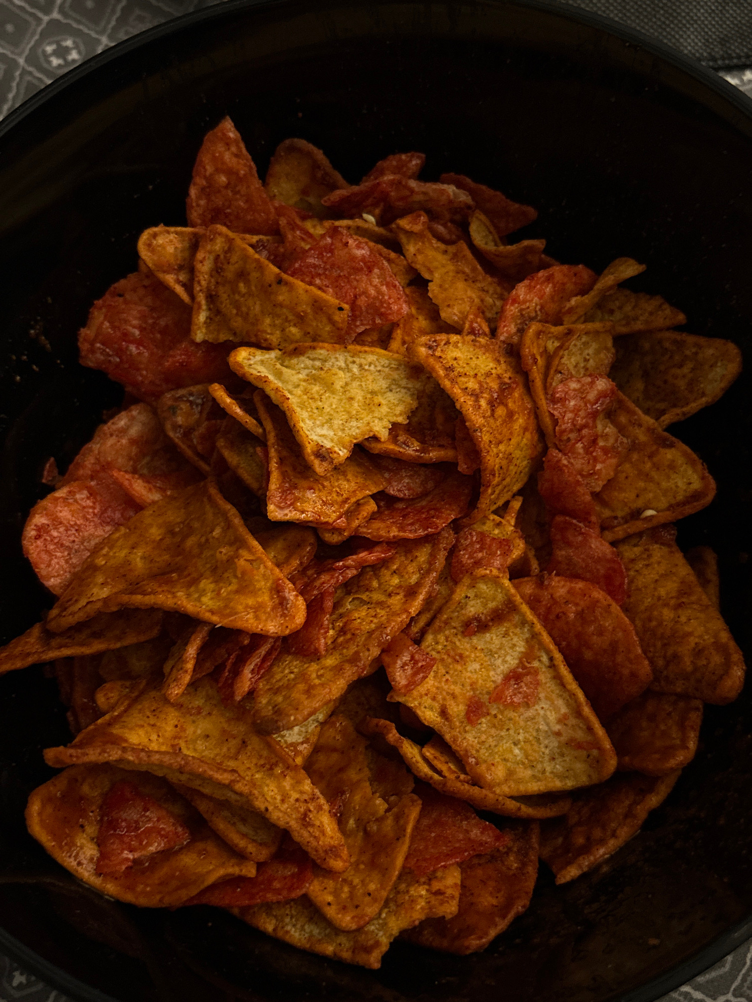 A close-up, high-angle shot shows a black bowl filled with numerous tortilla chips. Some chips appear golden brown with a seasoned surface, while others have a reddish tint, possibly due to a differen…read more