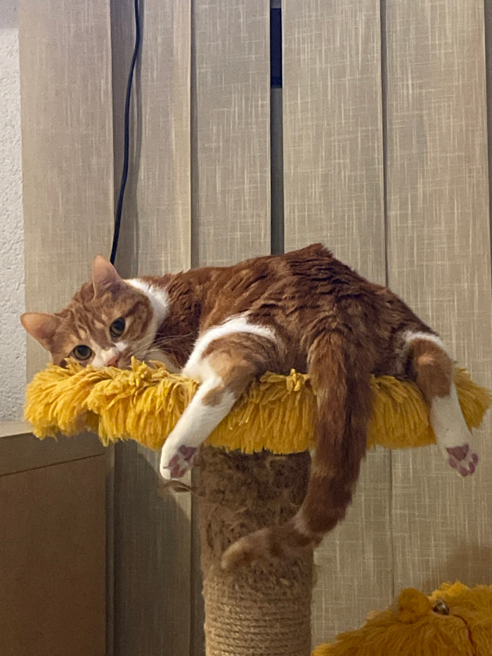 An orange and white tabby cat is upside down, clinging to a cat tree with a yellow fluffy ring. The cat faces the viewer with green eyes. Its paws are visible, showing pink paw pads. The background co…read more