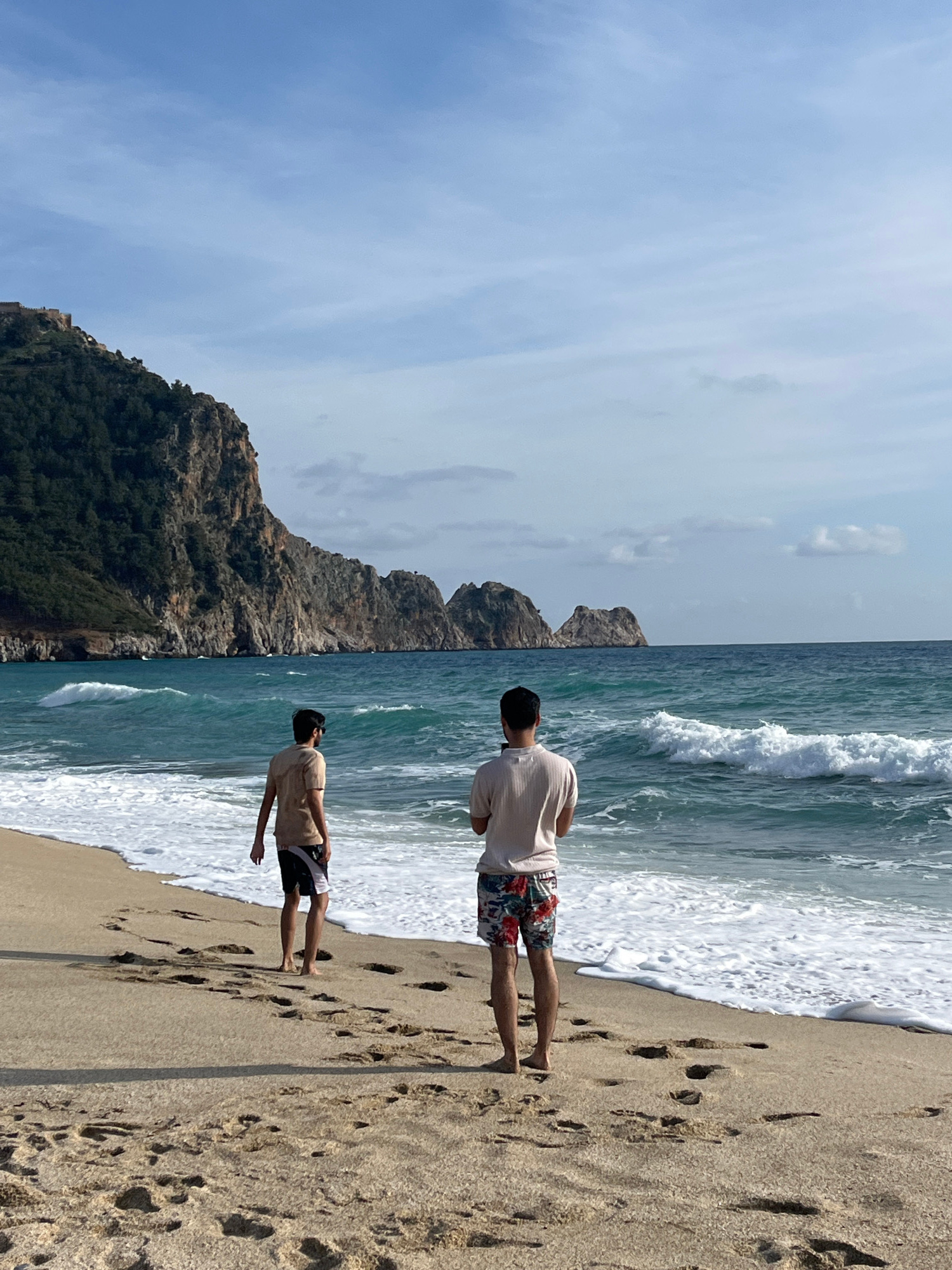 The image displays a coastal scene on a sandy beach in Alanya, Turkey. Two adult males are observed from behind, facing the Mediterranean Sea. The male on the left, wearing a light brown t-shirt and d…read more