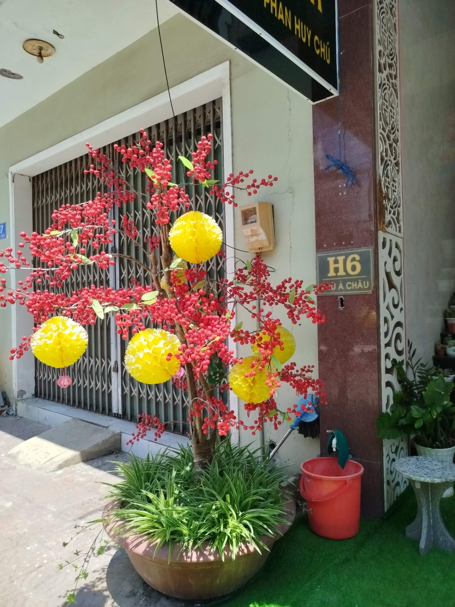 A color photograph shows a potted plant with red berries and yellow spherical decorations standing in front of a building in Ho Chi Minh City, Vietnam. The plant sits in a brown pot filled with green…read more