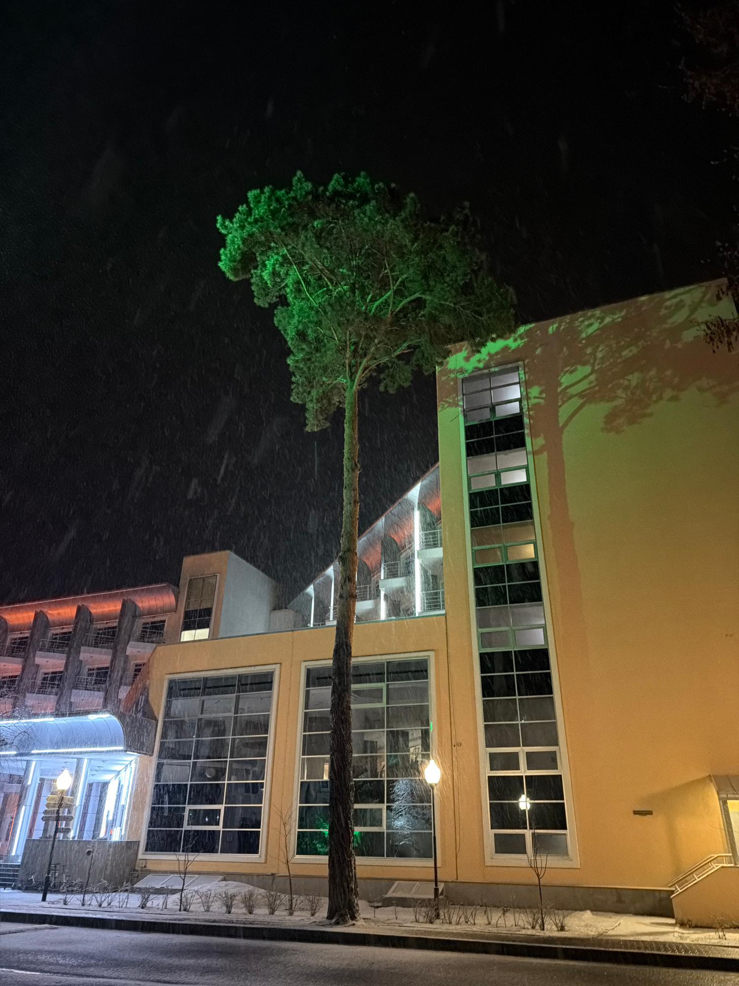 The image depicts a nighttime scene with a building and a tree in Tyumen, Russia. The building is illuminated, with multiple windows visible on several floors. The tree, with green foliage, stands pro…read more