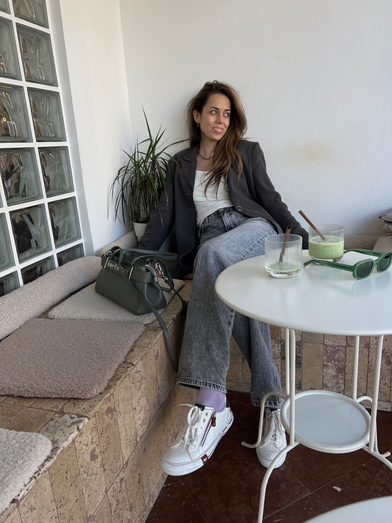 A young woman sits sideways at an outdoor cafe table. She wears a pinstripe blazer, white top, gray jeans, and white sneakers with red trim. A plant sits behind her by a wall of glass blocks. On the t…read more