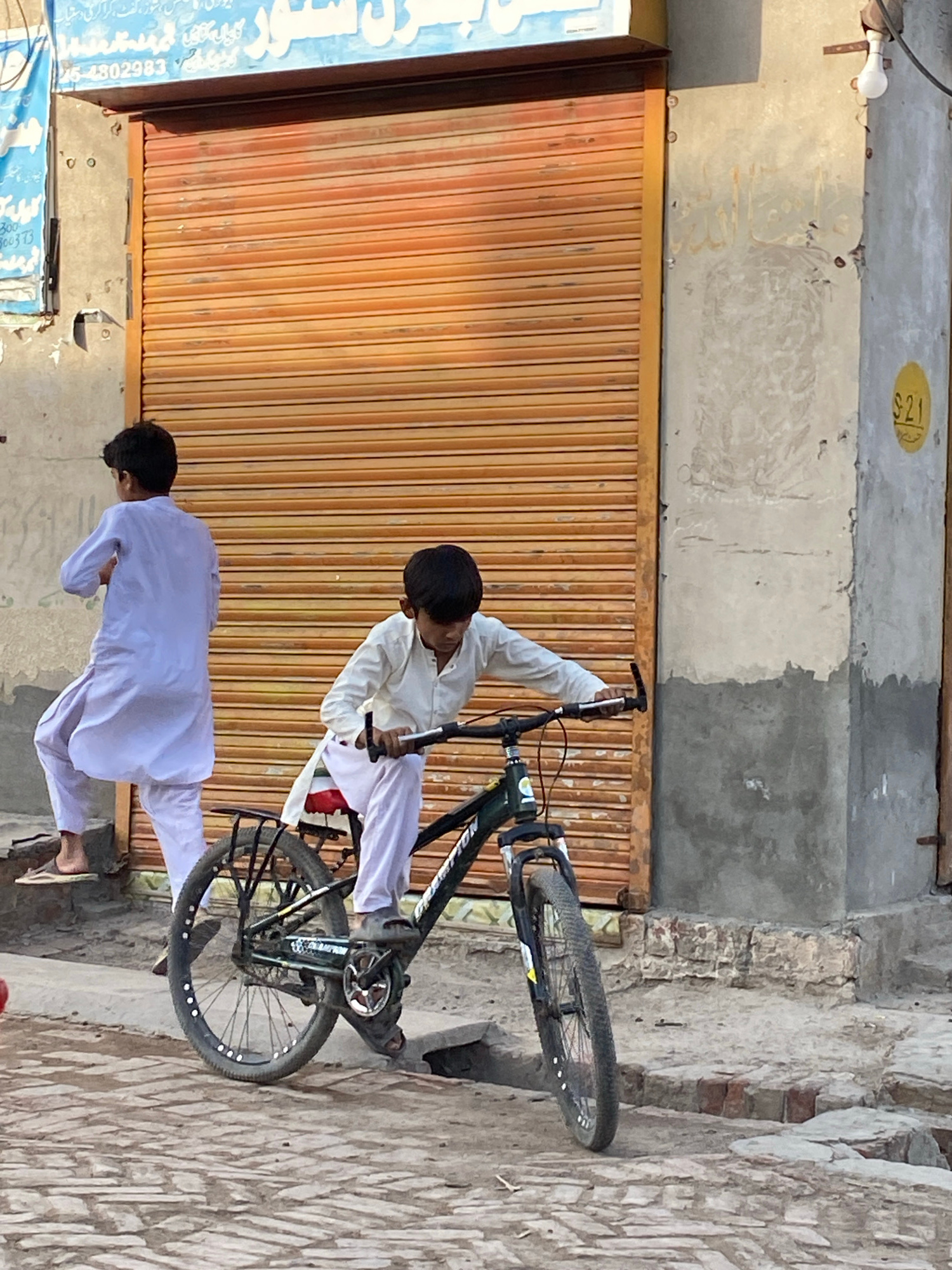 Two young males, dressed in white shalwar kameez, are depicted on a sunlit street in what appears to be Karamsar, Pakistan. One boy is seated on a dark-colored mountain bicycle, holding the handlebars…read more