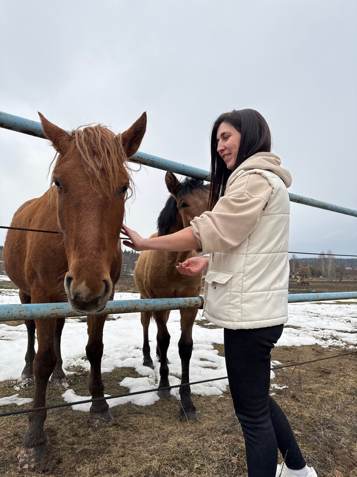 A woman in a white vest and black leggings pets two brown horses through a blue metal fence. The location is grassy with patches of snow, suggesting a rural setting in Opary, Russia. The sky is overcaβ¦read more