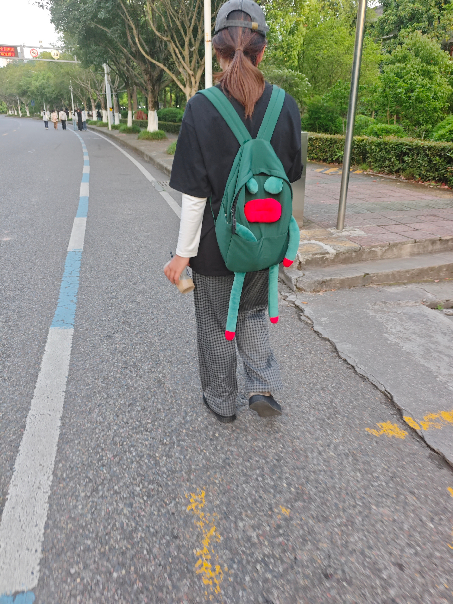 A person is walking on the side of a road, as seen from the rear view. The individual, likely a woman, has a ponytail, wears a gray baseball cap, black shirt over a long-sleeved white shirt, and checkβ¦read more