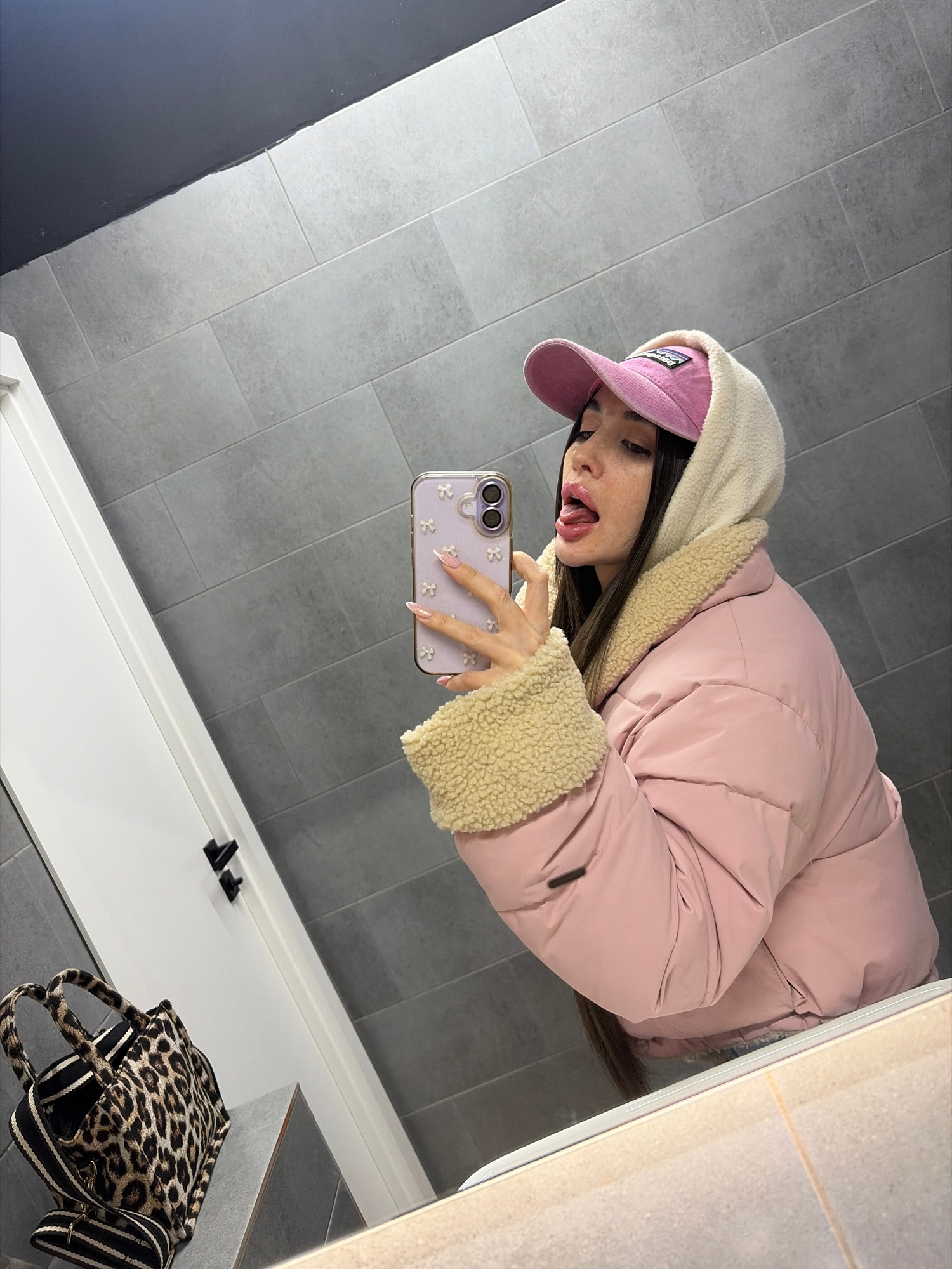 A young woman in a pink baseball cap and a pink puffer jacket with a beige sherpa lining is taking a selfie in what appears to be a bathroom. The walls are tiled in gray. A white door with black hardwβ¦read more