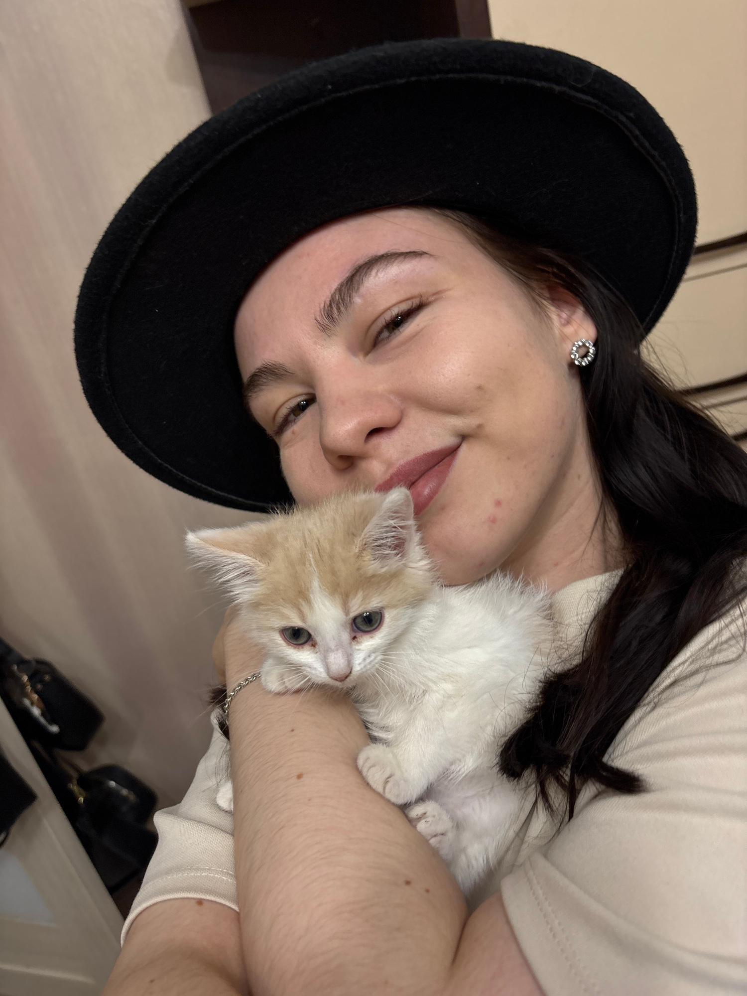 The image, taken in Perm, Russia, features a young adult woman cuddling a small kitten in an indoor setting. The woman is positioned on the left side of the frame, looking towards the camera with a sl…read more