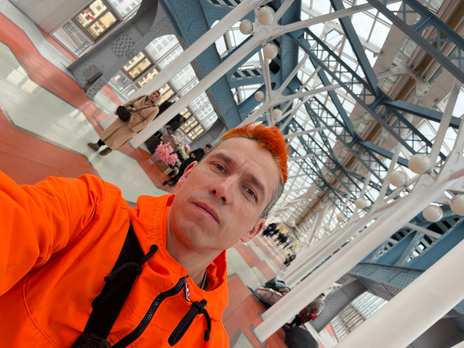 A man in an orange hoodie is taking a selfie. He has orange hair. The background includes a steel structure with windows, and people walking on an elevated platform. Based on the steel structure and a…read more