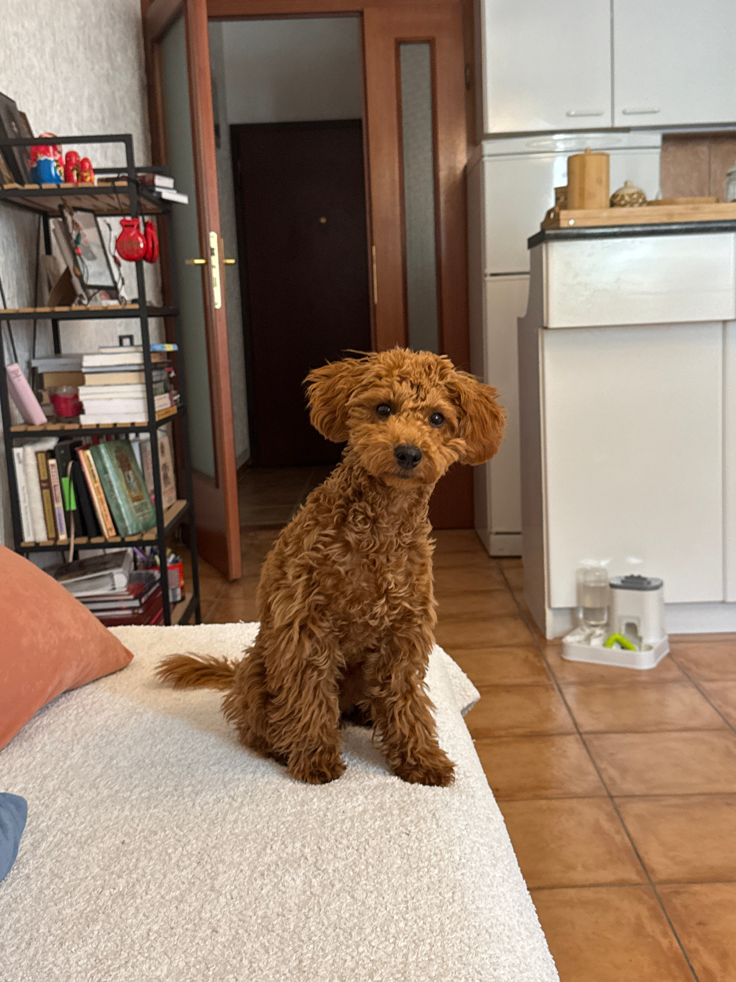 A medium-sized, brown, curly-haired dog, likely a poodle mix, is standing on a white, textured surface, possibly a sofa or bed. The dog is oriented towards the viewer, with its head tilted slightly to…read more