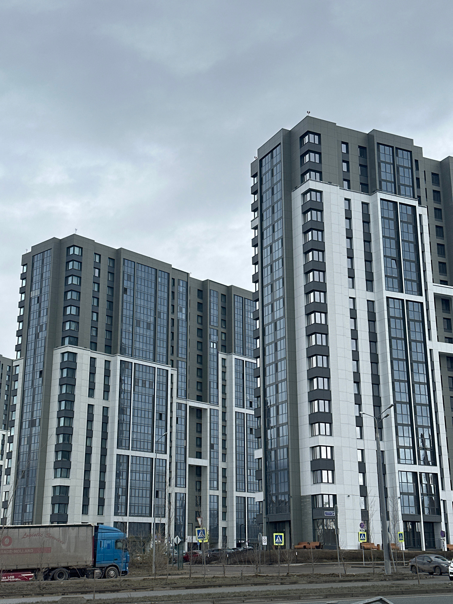 The image depicts two tall, modern apartment buildings with a distinctive architectural style, located in Kazan, Russia. The buildings feature a combination of grey and white facade panels, with numer…read more