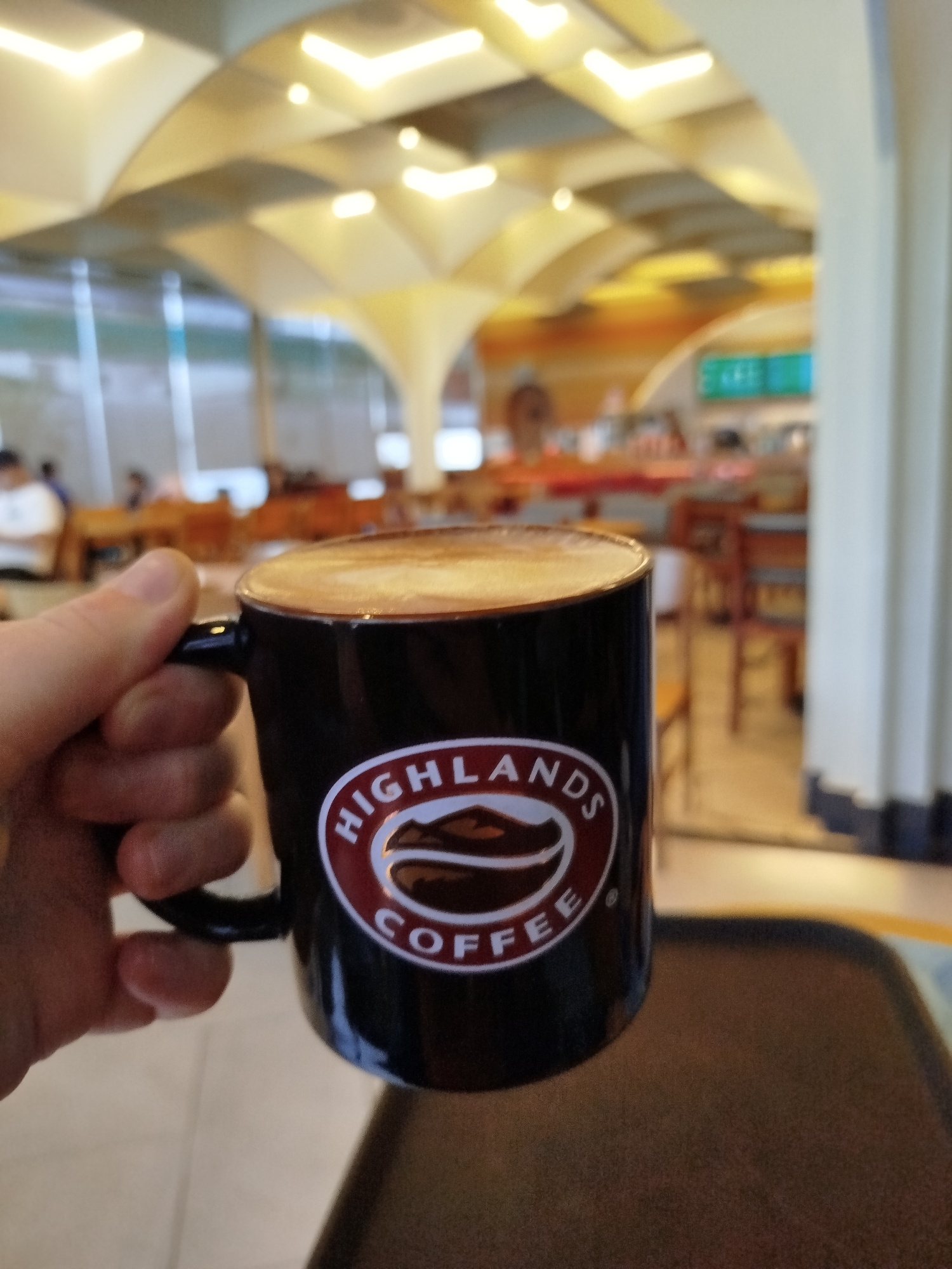 A medium shot shows a hand holding a black coffee mug with the Highlands Coffee logo. The mug contains a light brown, frothy beverage. The person holding the mug is not fully visible, focusing on the…read more