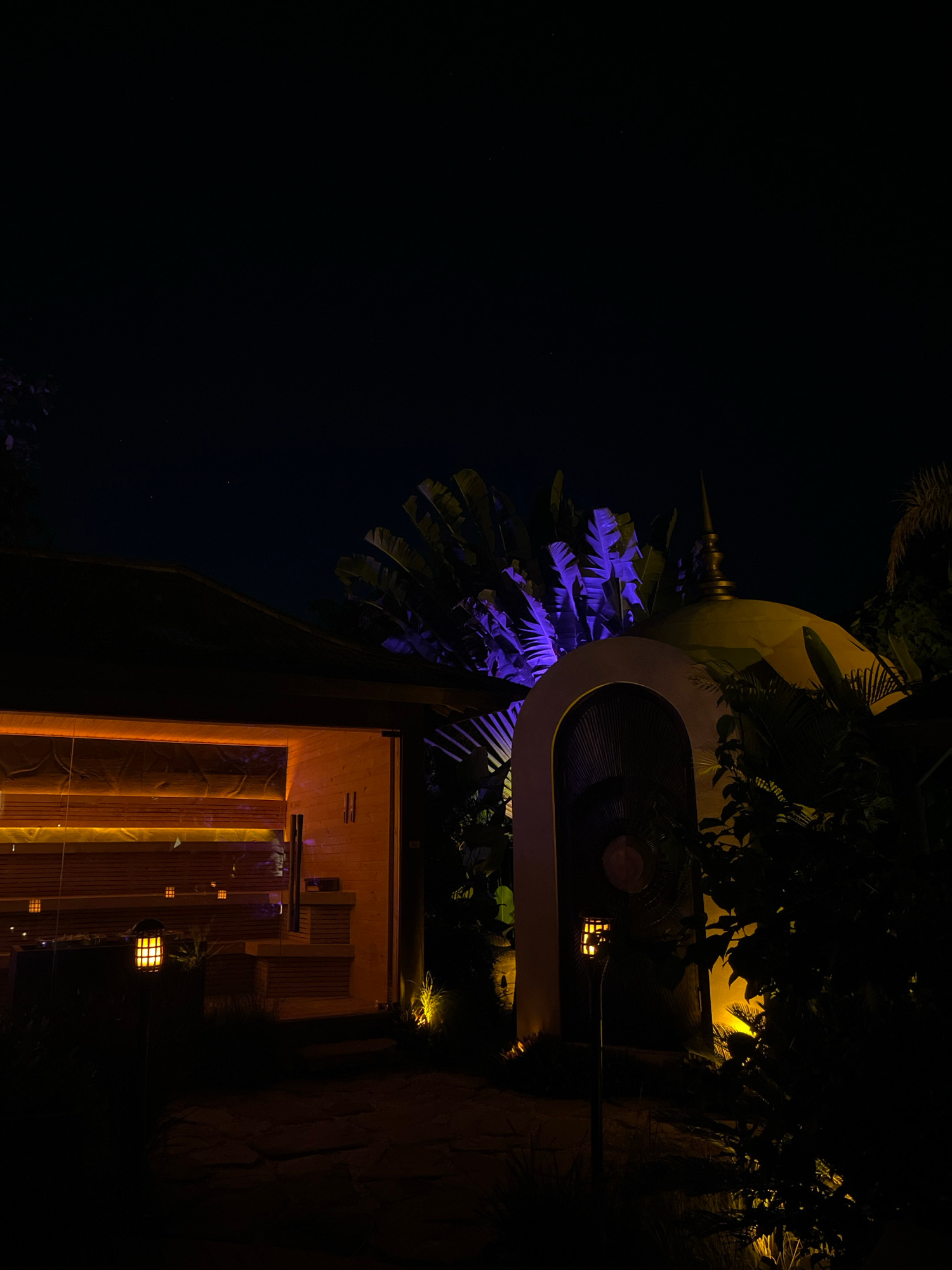 The image captures an outdoor night scene, likely at a resort or designed landscape in Mengwi, Indonesia. The sky is a deep, uniform black, indicating complete darkness, punctuated only by artificial…read more