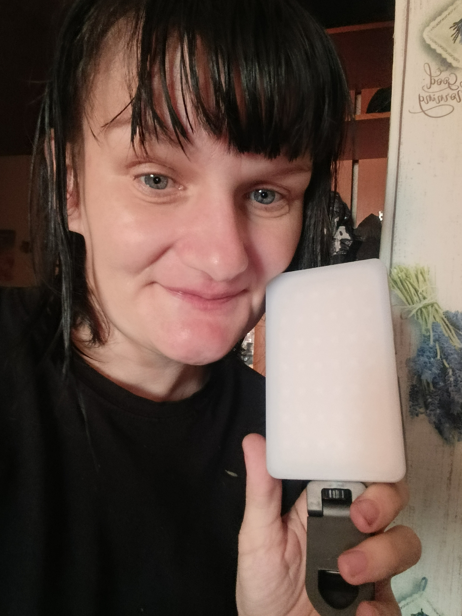 A woman is holding a white, rectangular object with a metal attachment in her right hand. She has short, dark hair with bangs and blue eyes. She is wearing a black t-shirt. The background includes a w…read more