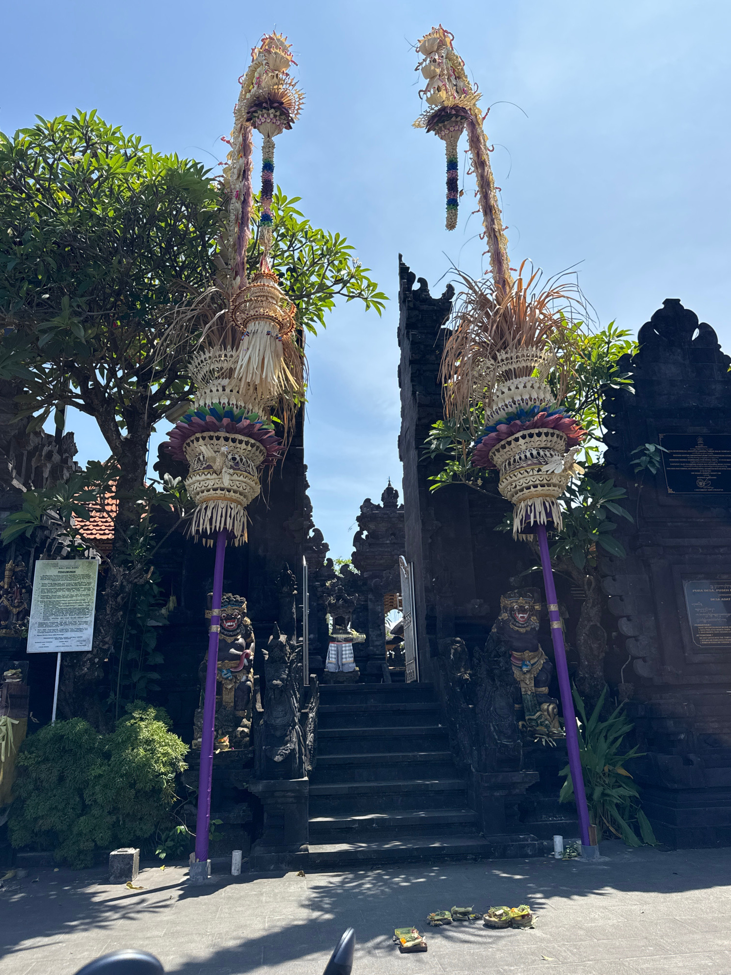 Two penjors, traditional Balinese bamboo poles decorated with woven coconut leaves and offerings, stand in front of a dark stone gate in Nusa Dua, Indonesia. The gate is adorned with carvings of deiti…read more