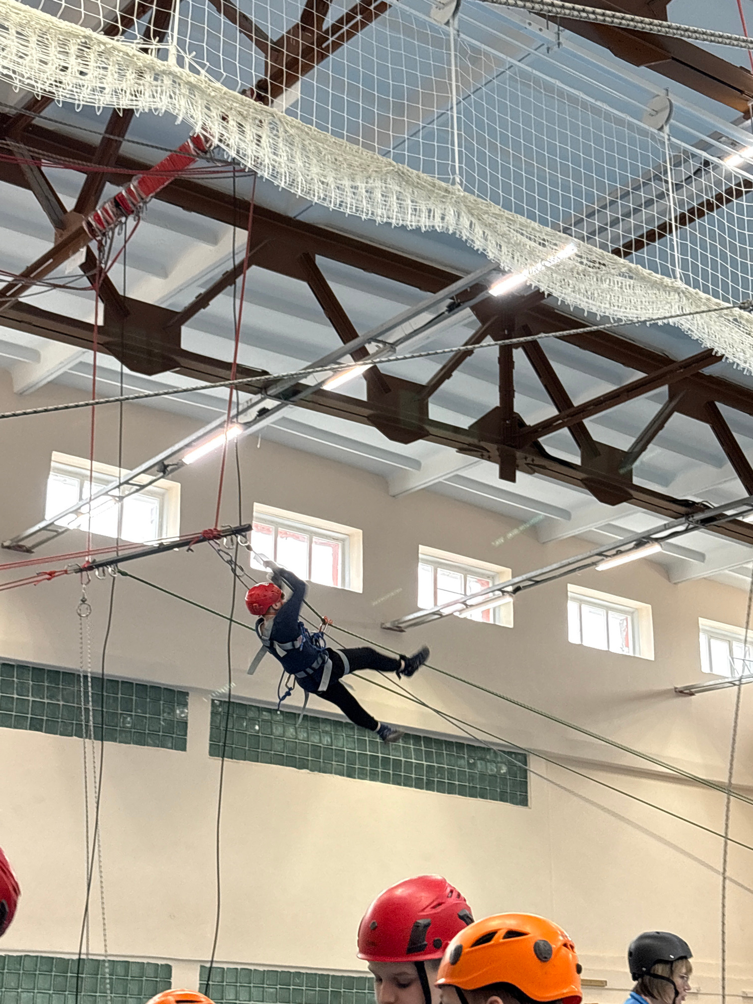 A view, tilted slightly to the left, shows a group of individuals participating in a high ropes course inside a building. The individuals are wearing helmets, some in red, others in orange and black.…read more