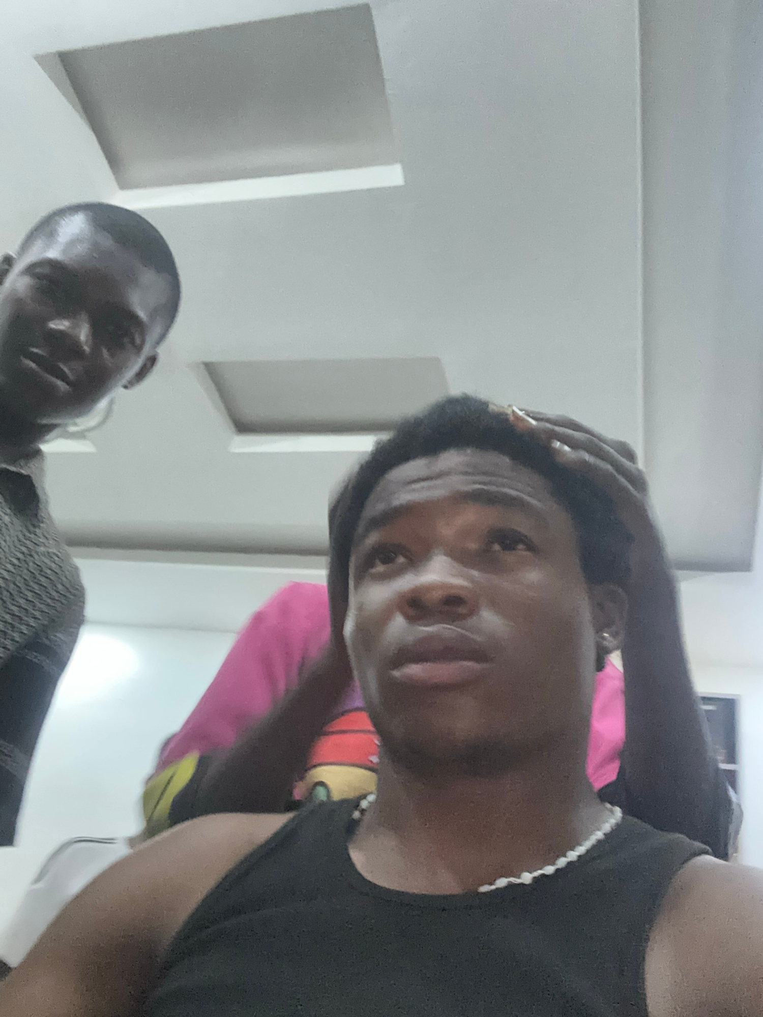 Two Black men are visible indoors. One man is facing the camera, wearing a black tank top and a beaded necklace, with a hand on his head. Another person, partially visible in the bottom left corner, iā¦read more