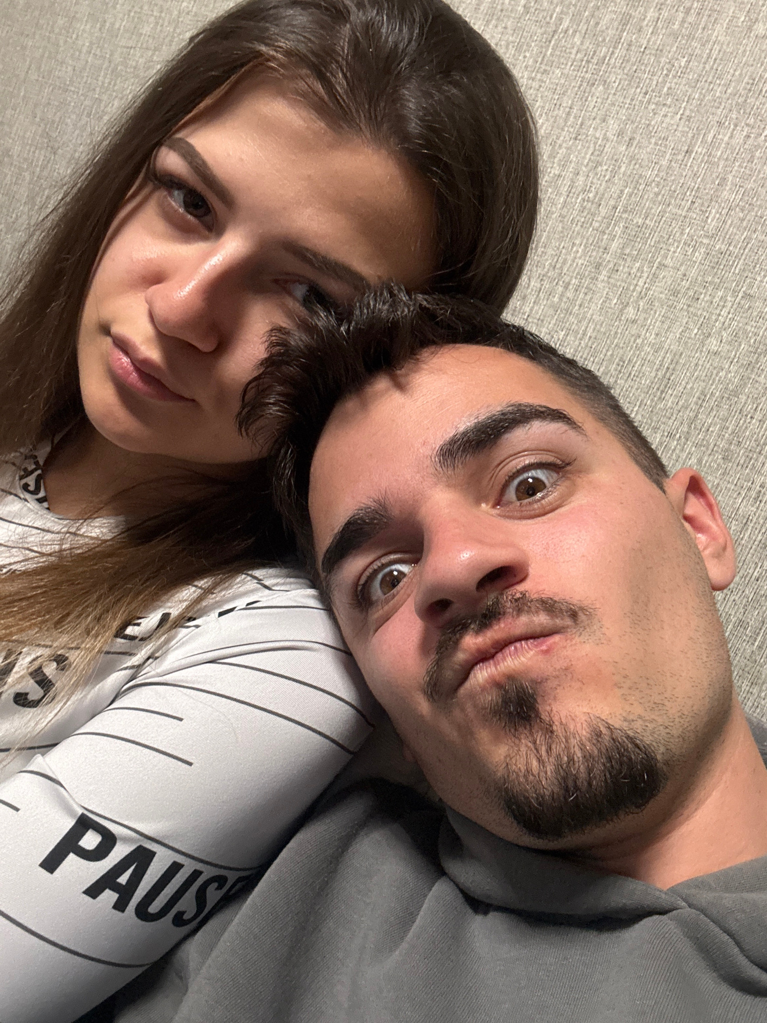This close-up image captures two young adults, a male and a female, in an intimate indoor setting. The scene is likely a selfie or a portrait taken from an overhead perspective, with both subjects loo…read more