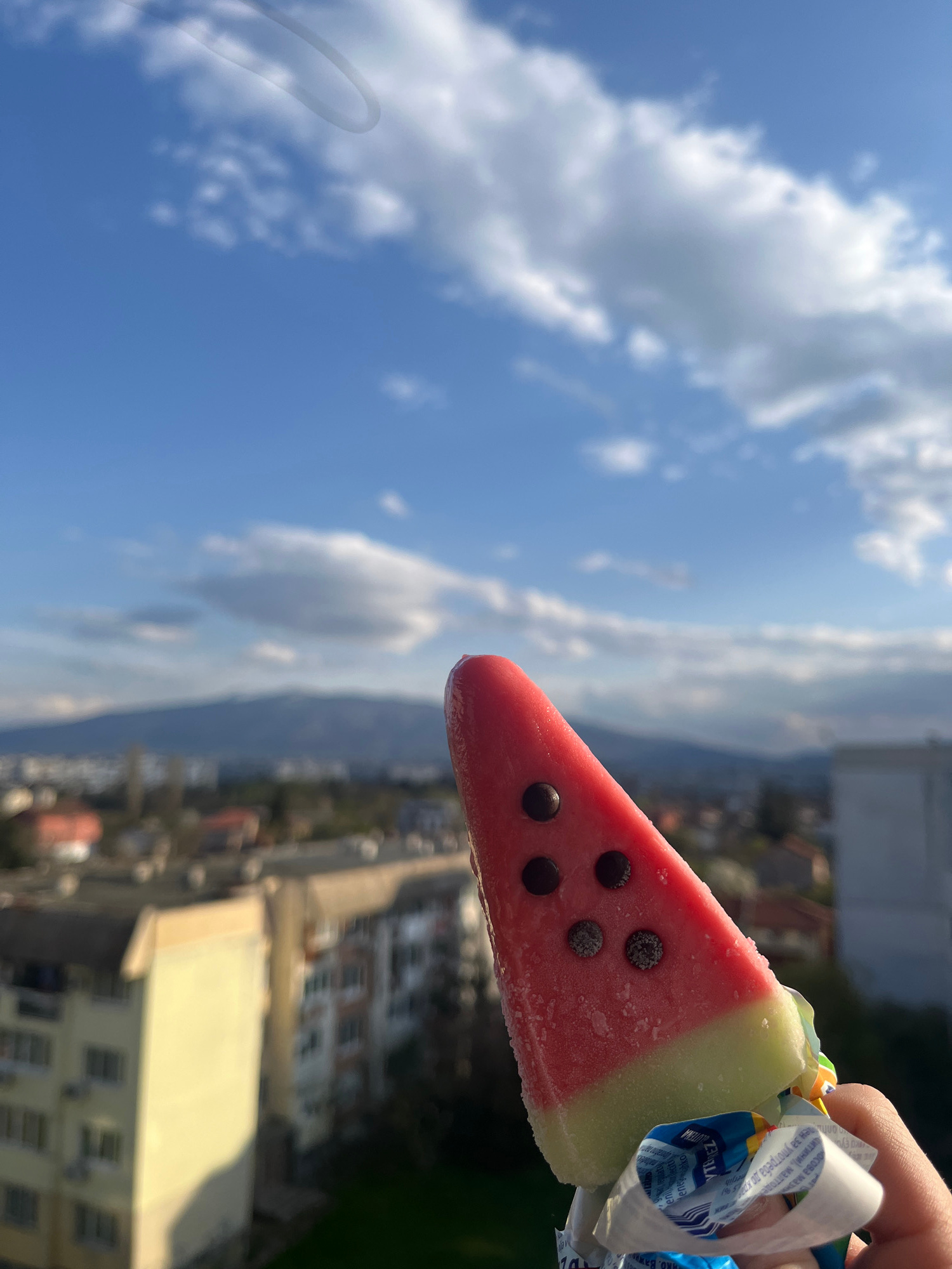 The photograph depicts a watermelon-flavored popsicle held against a backdrop of a cityscape and a cloudy, blue sky. The popsicle is shaped like a slice of watermelon, with a red section containing ch…read more