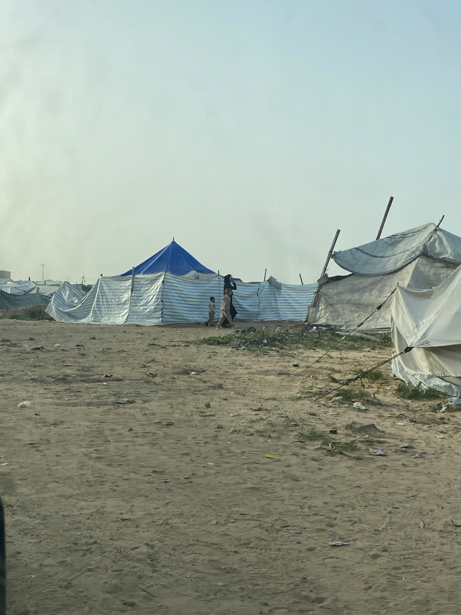The image depicts a row of makeshift shelters or tents lining a dirt path in Khan Yunis, Palestinian Territory. The structures are constructed from white and blue striped tarps, corrugated metal, andβ¦read more