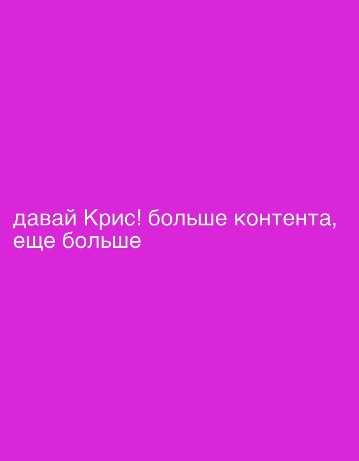 The image displays text in the Russian language against a magenta background. The text reads "давай Крис! больше контента, еще больше".