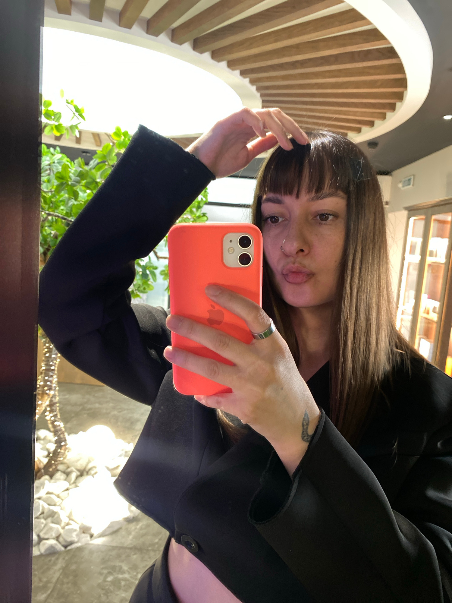 A young woman takes a selfie indoors. She holds a coral-colored iPhone in her right hand, which is adorned with a simple silver ring on her ring finger and a tattoo on her wrist. She has brown hair wi…read more
