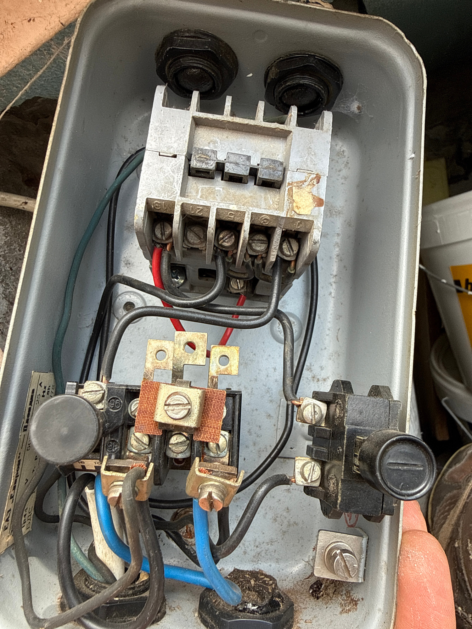 The image depicts the interior of an open, rectangular, light gray metal electrical box. Inside the box, there are multiple electrical components. On the left is a gray, multi-terminal block with mult…read more