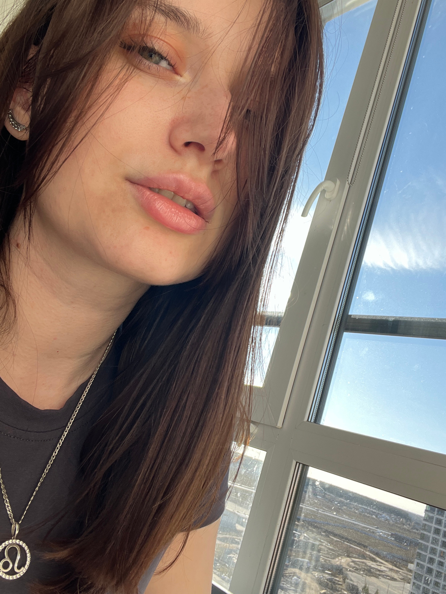 A close-up, tilted selfie captures a person with long, dark brown hair, partially obscuring their face. One eye, subtly made up, is visible, along with their nose and full, slightly parted lips. A sil…read more
