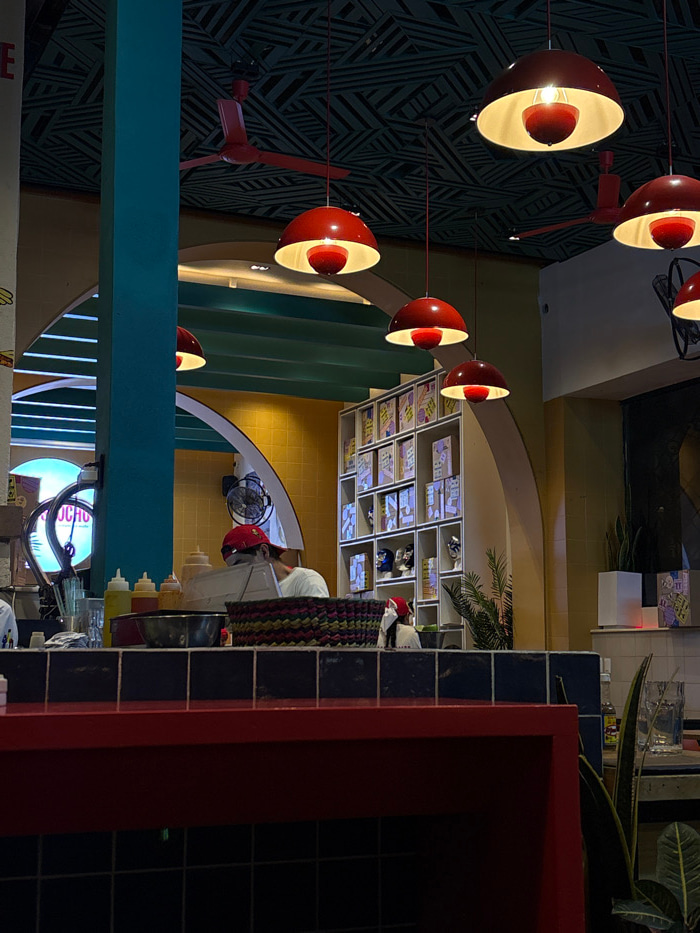 A vibrant interior space features distinctive red and white globe pendant lights suspended against a dark, patterned wall. A teal beam crosses the foreground, leading the eye towards a counter area wi…read more