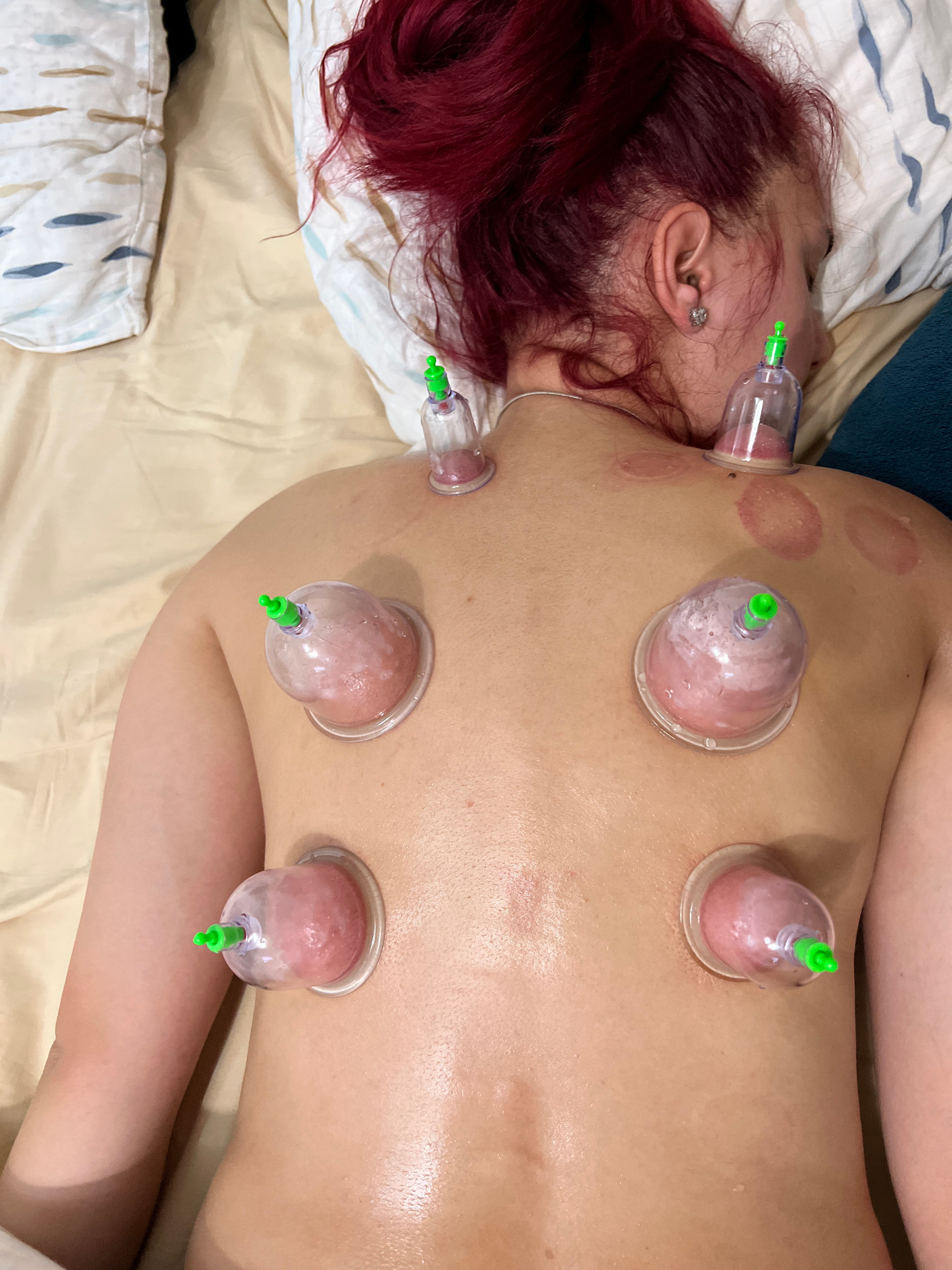 A woman with red hair lies face down on a bed covered in a beige sheet, having cupping therapy. Seven transparent plastic cups with green valves are attached to her back, creating circular red marks o…read more