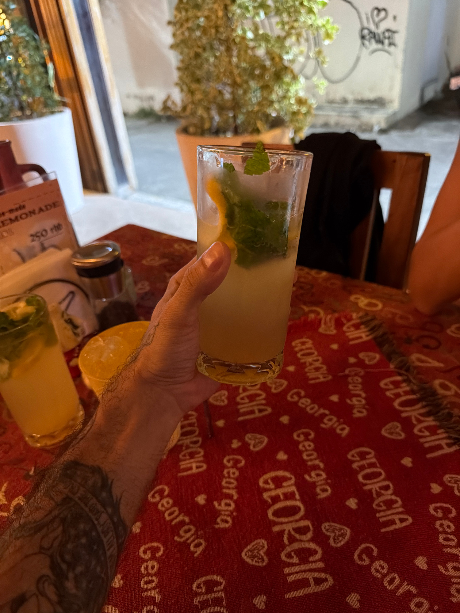 A first-person perspective photograph depicts an outdoor dining scene at night in Rawai, Thailand, as evidenced by legible graffiti displaying "RAWAI" and a heart symbol on a light-colored building wall in the background. The foreground features a person's right forearm, which exhibits hair and a dark tattoo, holding a tall clear glass. This glass contains a light yellow beverage, ice cubes, sliced lemons, and fresh mint leaves. The glass is positioned above a wooden table covered by a red tablecloth patterned with repeating white text "GEORGIA" and small heart symbols. On the table, to the left, are a second partially visible similar glass with a drink, a small yellow bowl filled with ice, a metal-capped shaker, a white napkin holder, and a wooden menu holder displaying "LEMONADE" and "250 THB". Potted green foliage is visible in the mid-ground, partially obscuring the background wall and a paved surface. A segment of a wooden chair and a second person's leg are visible on the far right of the frame. | Open Wire