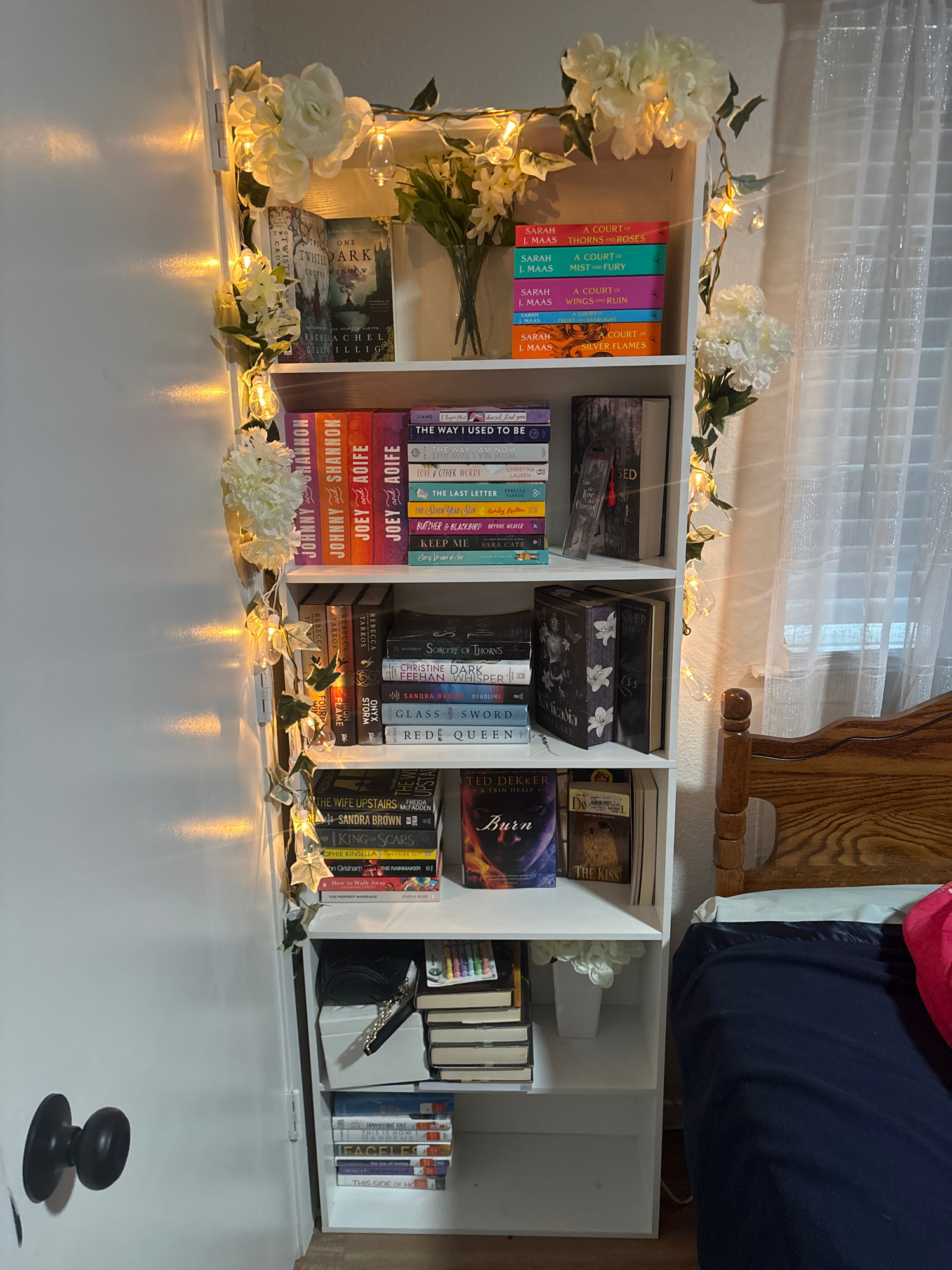 This indoor scene features a white bookshelf filled with books and adorned with floral decorations and fairy lights. The books are neatly arranged and include titles such as "A Court of Thorns and Ros…read more
