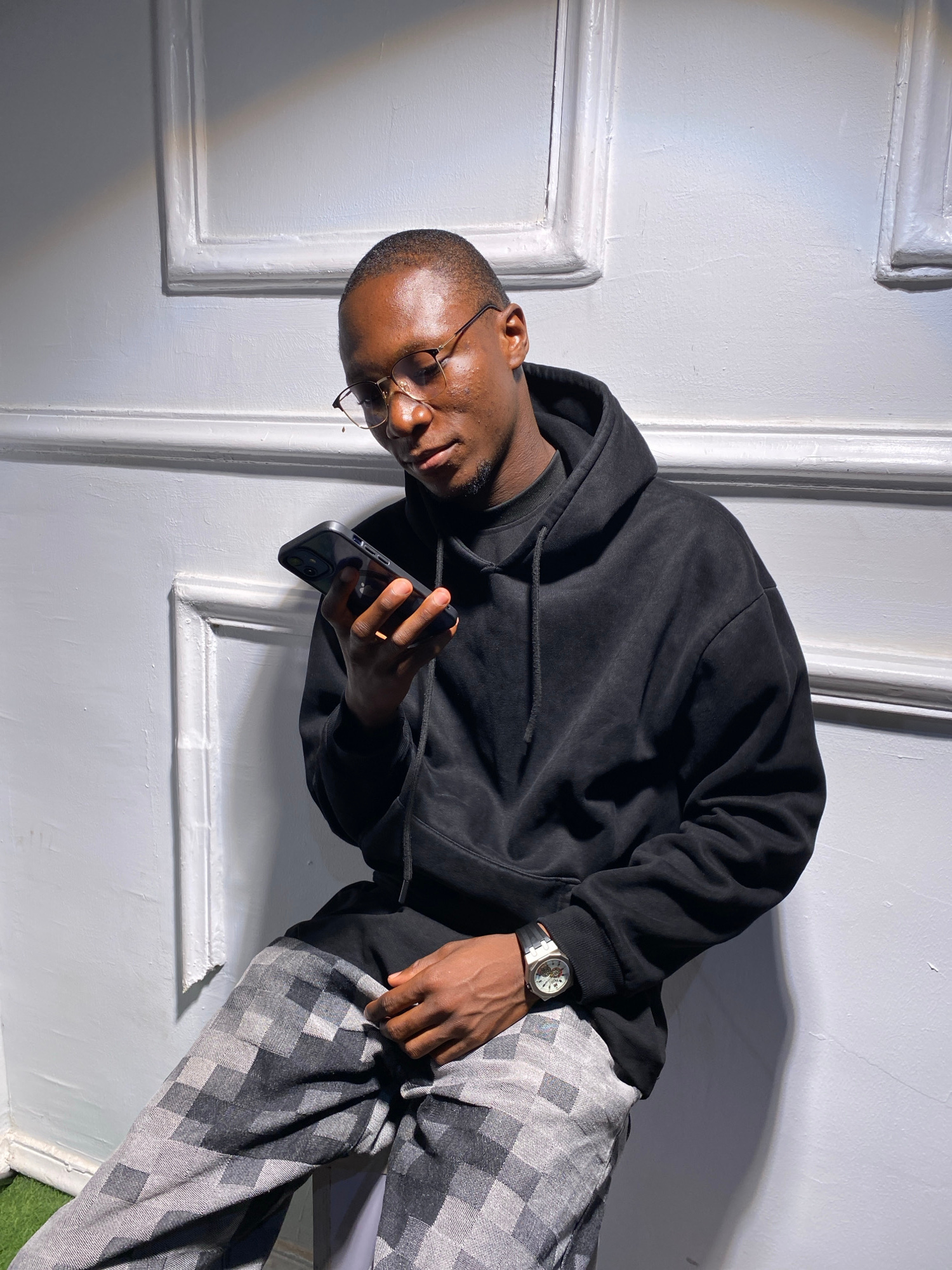 The image, presented rotated 90 degrees counter-clockwise, depicts a dark-skinned man seated or leaning against a white wall. The setting is identified as Barakin Akawo, Nigeria. He has a shaved headβ¦read more
