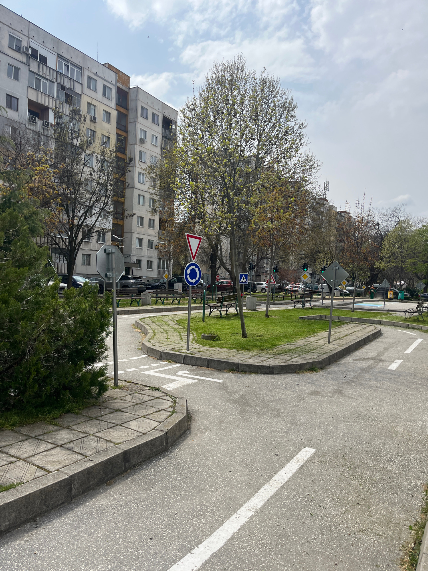 The image depicts a street scene in Plovdiv, Bulgaria, featuring a mock roundabout with traffic signs, including a yield sign and a circular road sign. A multi-story residential building stands to the…read more
