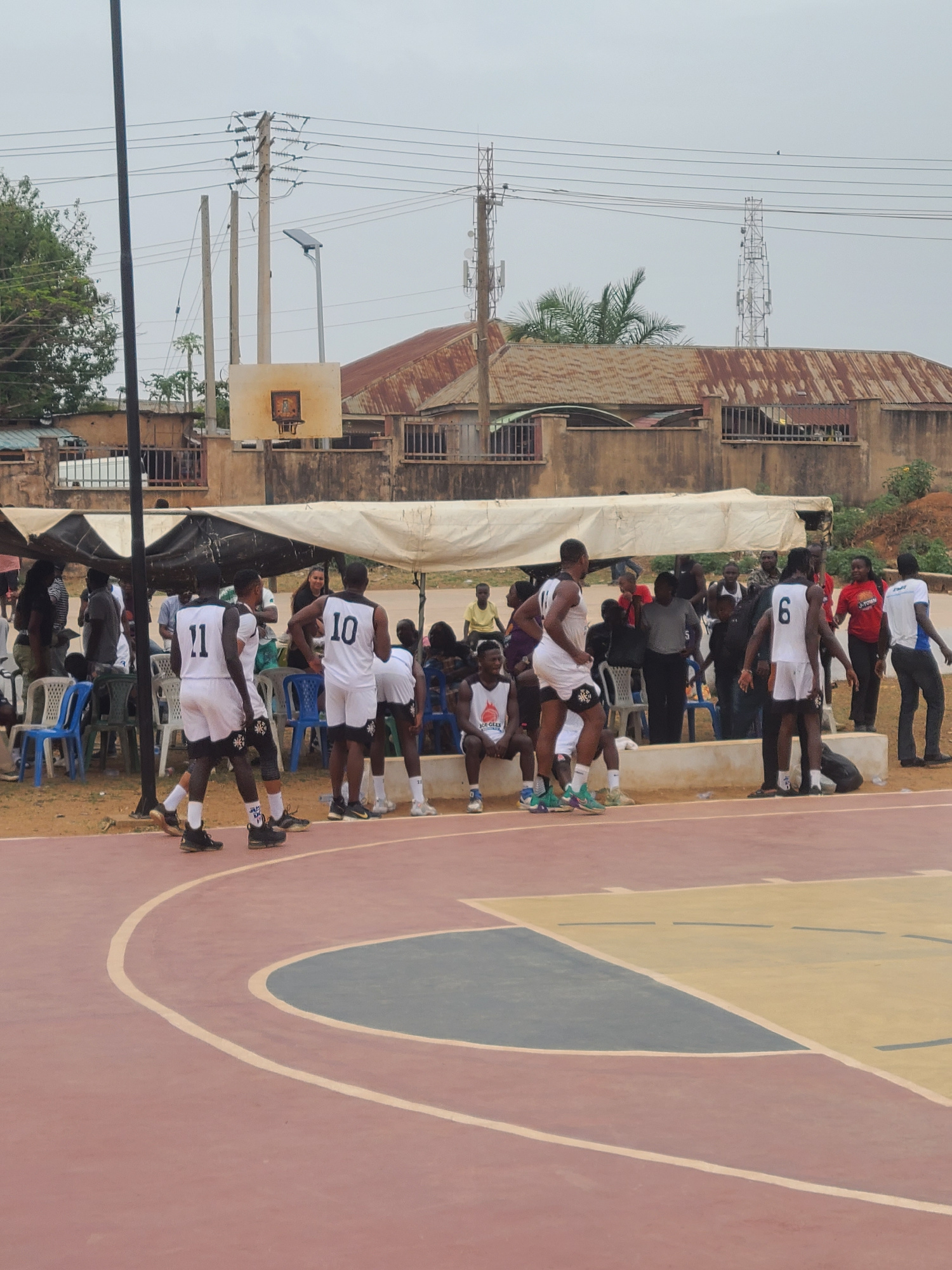 The image shows a basketball court with players seated on chairs along the sidelines. The players are wearing white jerseys with numbers. Behind the players, there is a temporary tent-like structure. Beyond the tent is a weathered building with a corrugated iron roof and multiple windows. Power lines and utility poles are visible in the background. The basketball court has painted sections in red, yellow, and blue. The overall location appears to be an urban area, likely in Jos, Nigeria. The setting is outdoors, seemingly during a game or practice session. | Open Wire