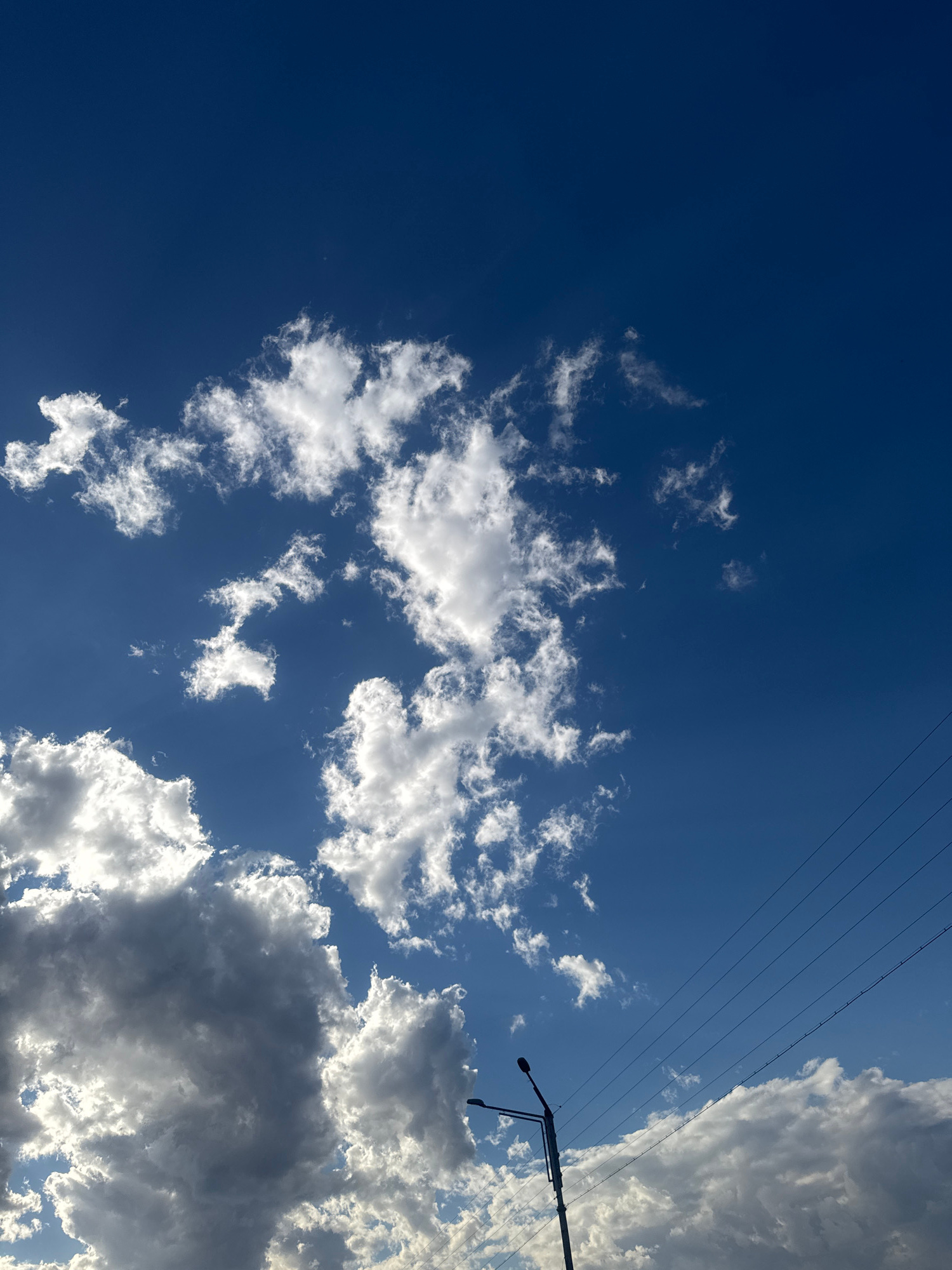 The image captures a view of the sky in Tbilisi, Georgia. A deep blue sky is partially covered with white and gray clouds. Electrical power lines and a street light extend into the scene from the uppe…read more