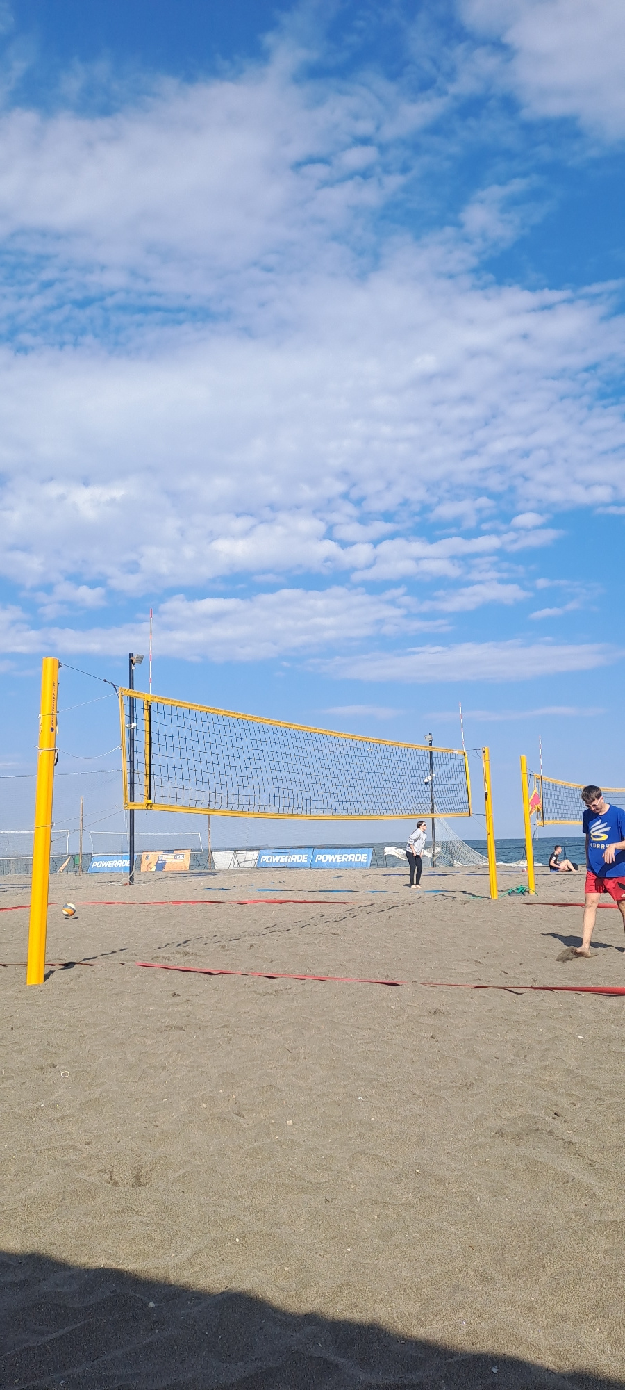 This image captures a vibrant beach volleyball scene under a bright, partly cloudy sky in Burgas, Bulgaria. The sky is a clear blue with scattered white, wispy clouds, suggesting fair weather. The pr…read more