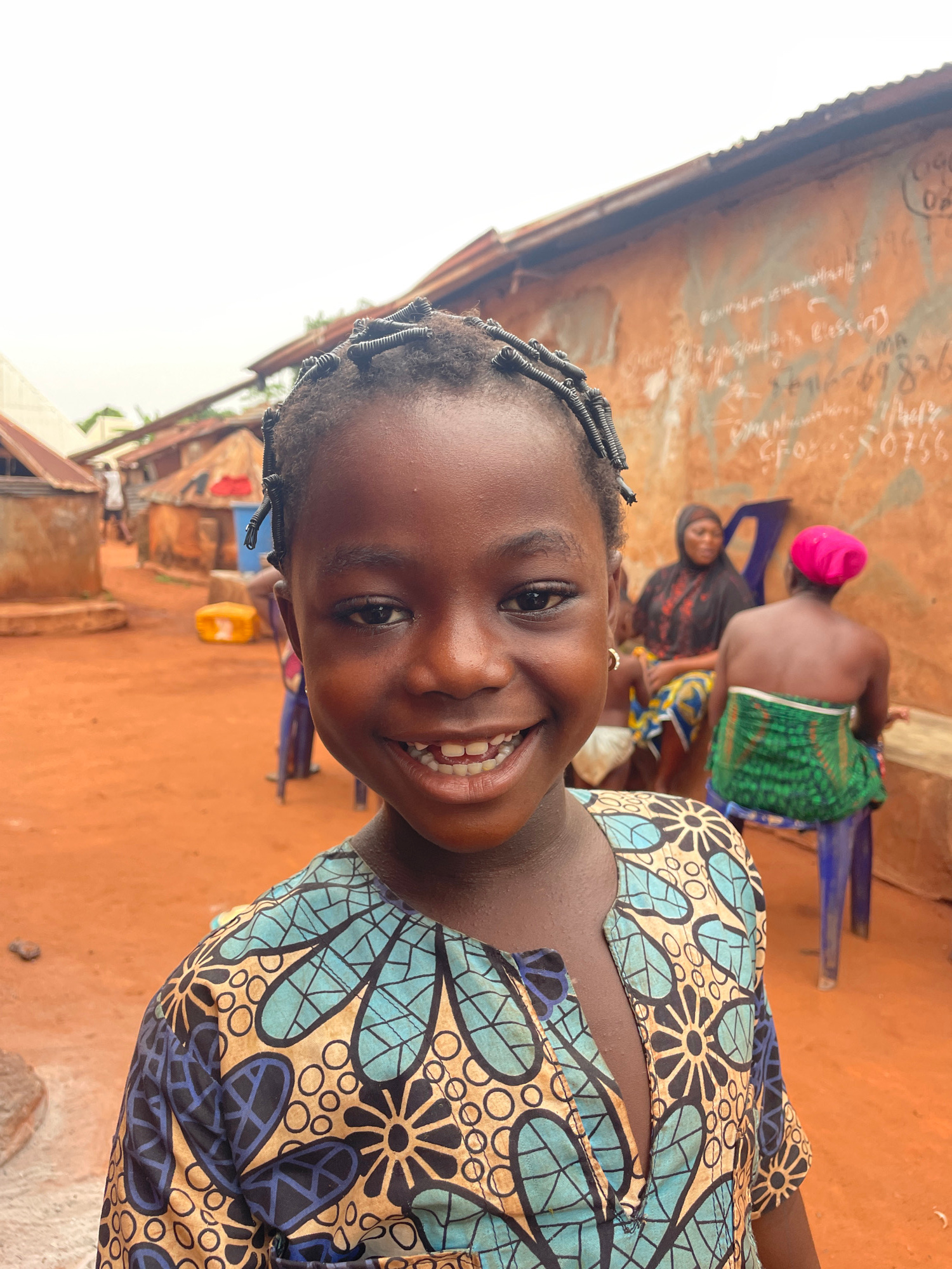 A young girl is the primary subject, smiling broadly at the camera. She has dark hair styled with what appears to be black wire or thread, and she wears an African print dress with blue, tan, and blac…read more