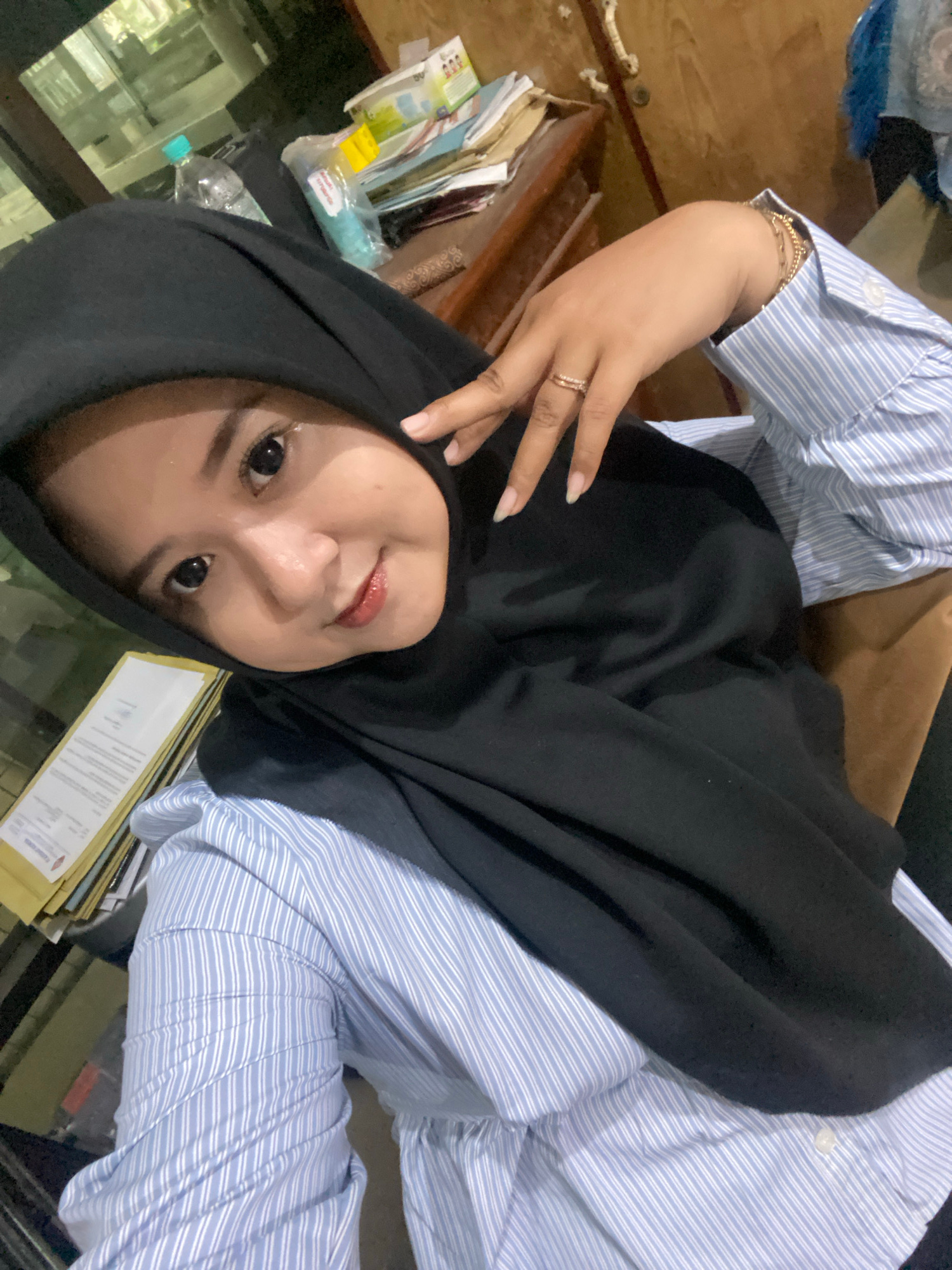A woman wearing a black hijab and a blue and white striped shirt is in Surabaya, Indonesia. She is looking at the camera. Her hand is visible, adorned with a bracelet and a ring. A stack of papers and…read more