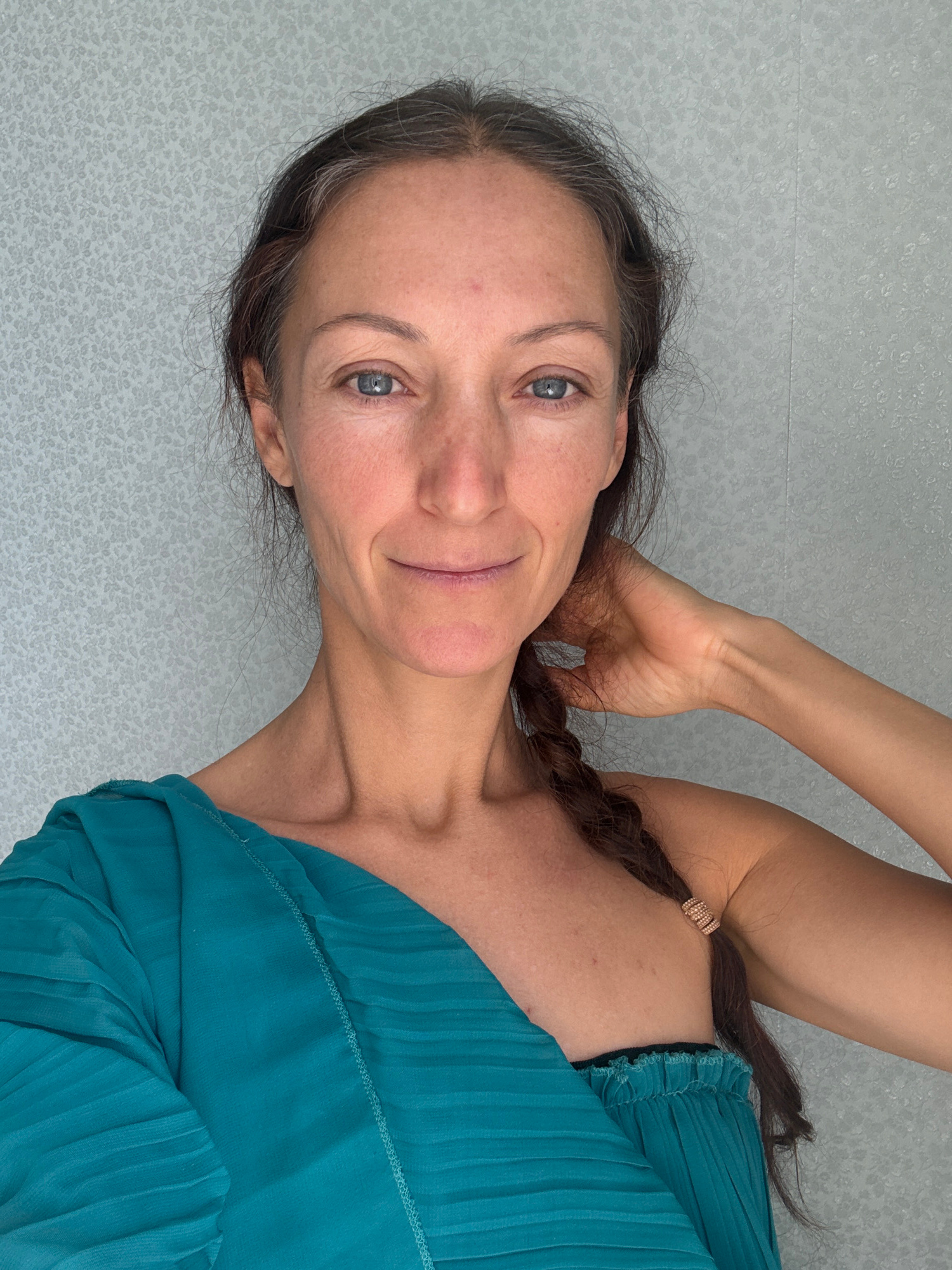 A woman with fair skin, graying brown hair in a braid fastened with gold-colored bands, and blue eyes is posing for a selfie. She is wearing a teal-colored pleated garment. Her right hand is raised ne…read more