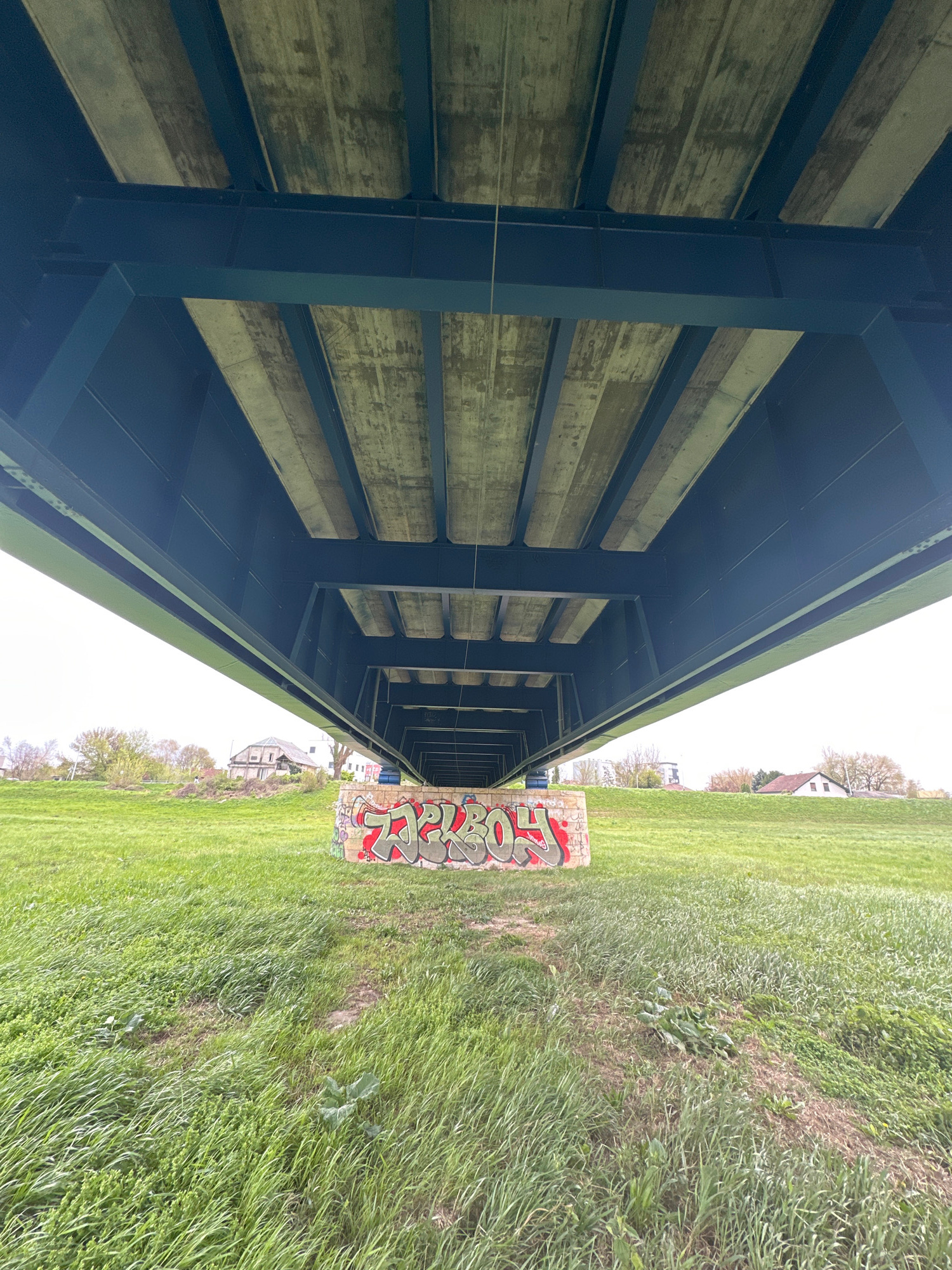 The image depicts the underside of a bridge, potentially a railway or road bridge, in what appears to be the City of Zagreb, Croatia, judging by the architectural style of the houses faintly visible i…read more