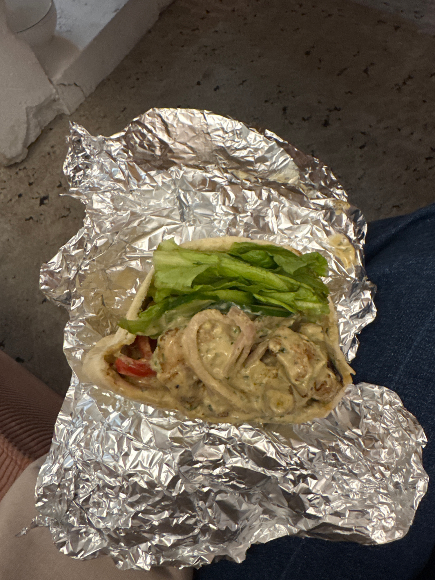 A gyro sandwich wrapped in aluminum foil sits on a person's lap. The sandwich contains lettuce, tomato, and a creamy meat filling. The person is wearing jeans. The location is unknown.