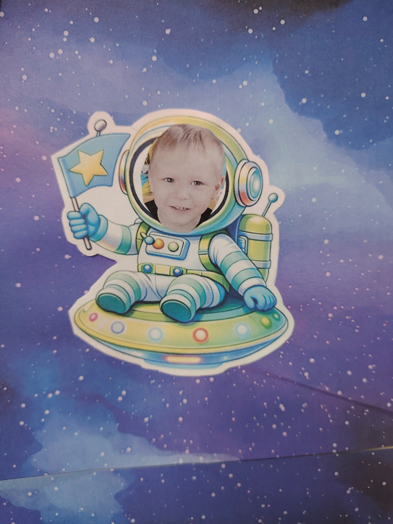 A close-up photograph shows a child's image superimposed on a cartoon astronaut sitting in a flying saucer, against a backdrop of a space-themed design. The astronaut is holding a flag with a star. Th…read more