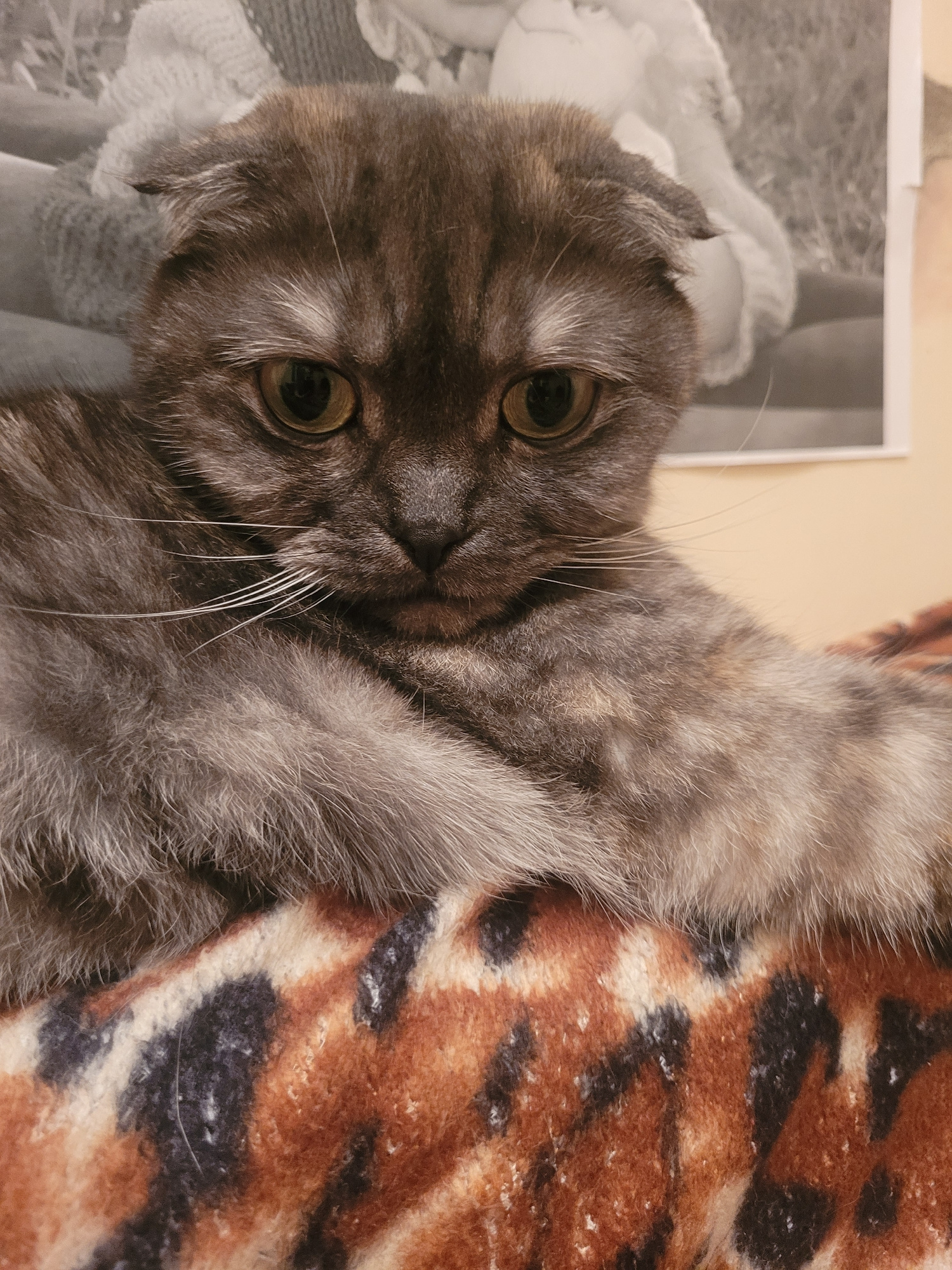 A gray Scottish Fold cat is lying on an animal print blanket. Part of a black and white photograph is visible in the background. The setting appears to be indoors. No information about Izhevsk, Russia…read more