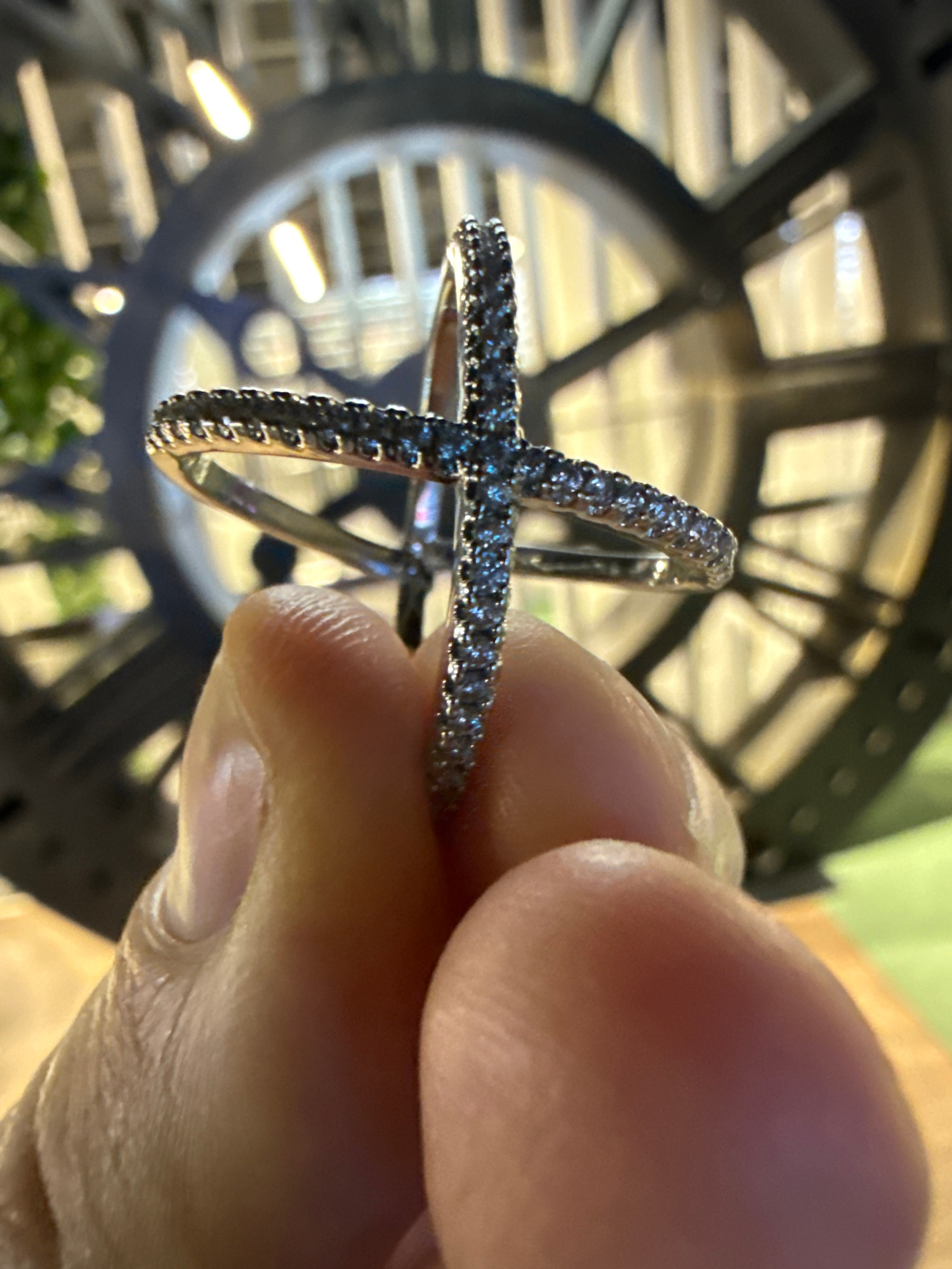 A person holds a silver-colored ring with dark stones against a backdrop of a large, circular, metallic structure. The structure has a radial design with crossbeams and circular supports, creating a c…read more