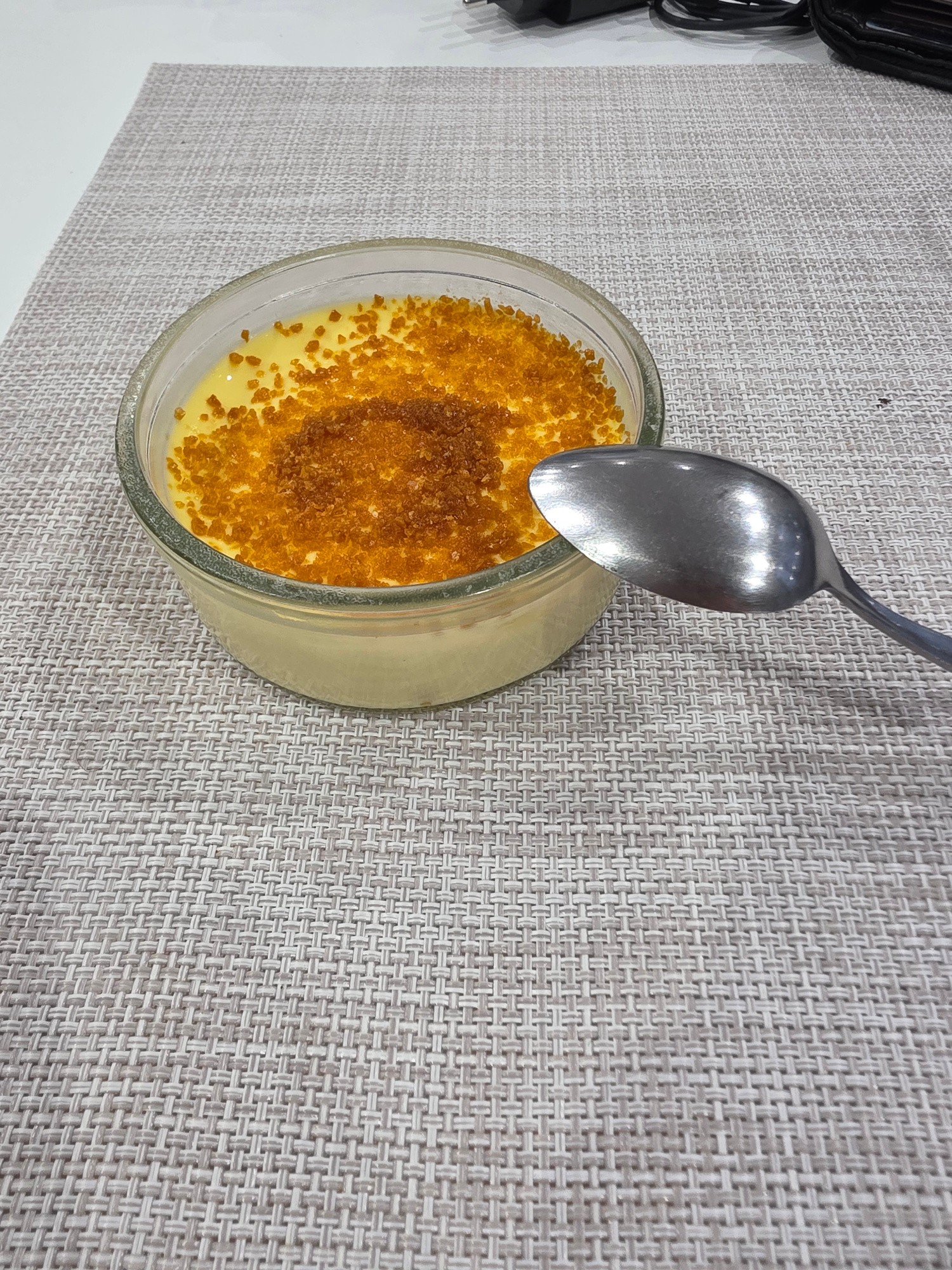 A glass bowl containing a yellow custard-like dessert with a caramelized sugar topping is positioned on a gray woven placemat. A silver spoon rests on the bowl. In the background, a portion of a blackβ¦read more