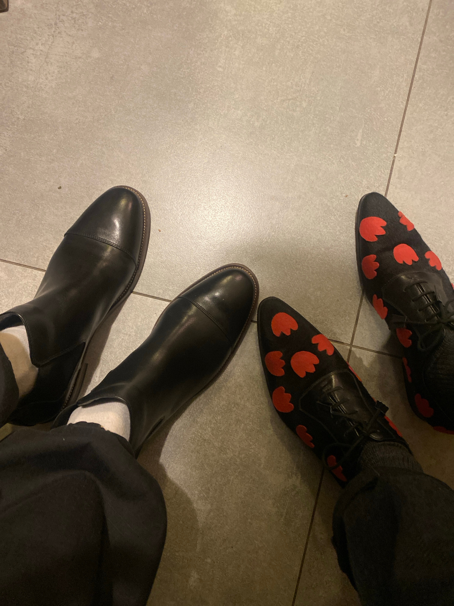The image shows two pairs of shoes on a light gray tiled floor. The top pair consists of black leather lace-up shoes with red floral patterns, worn with dark gray socks. The bottom pair is comprised o…read more