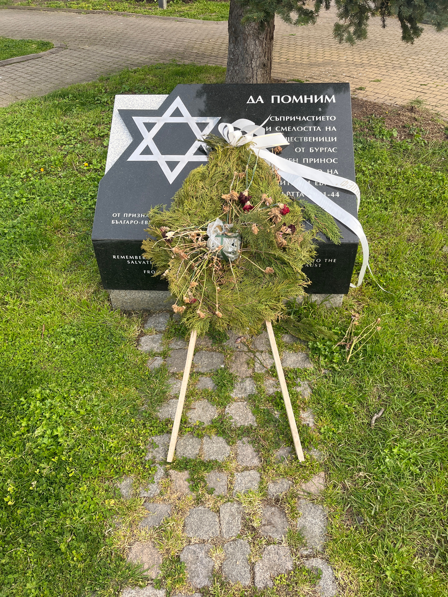 The image shows a black granite memorial stone, featuring a large white Star of David, set in a grassy outdoor area with a paved path nearby. A wreath made of evergreen branches and dried red flowers,…read more