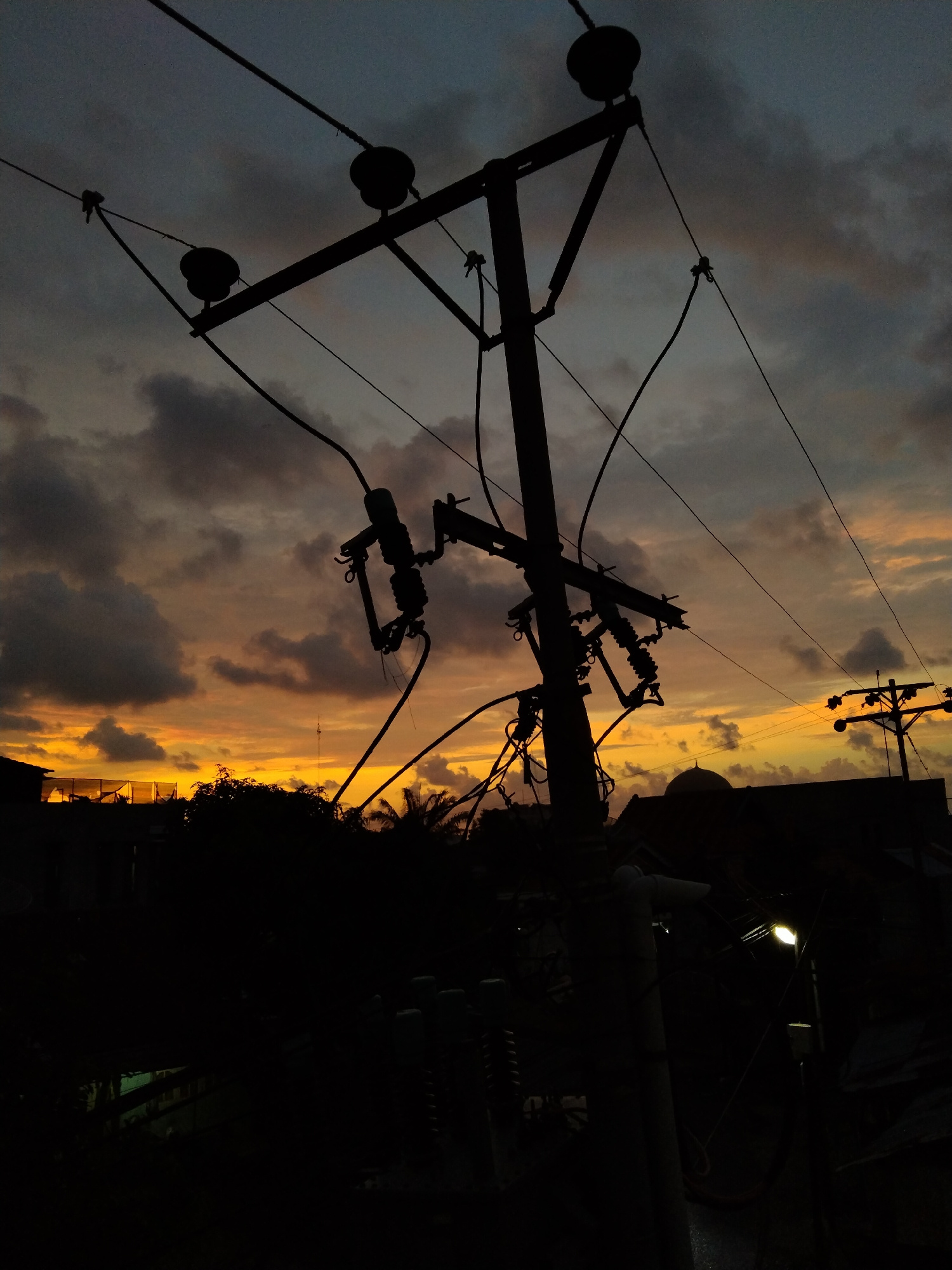 This image captures an outdoor scene at sunset in Bireuenmeunasahdayah, Indonesia, characterized by prominent silhouettes against a colorful sky. The central subject is a large utility pole, heavily l…read more