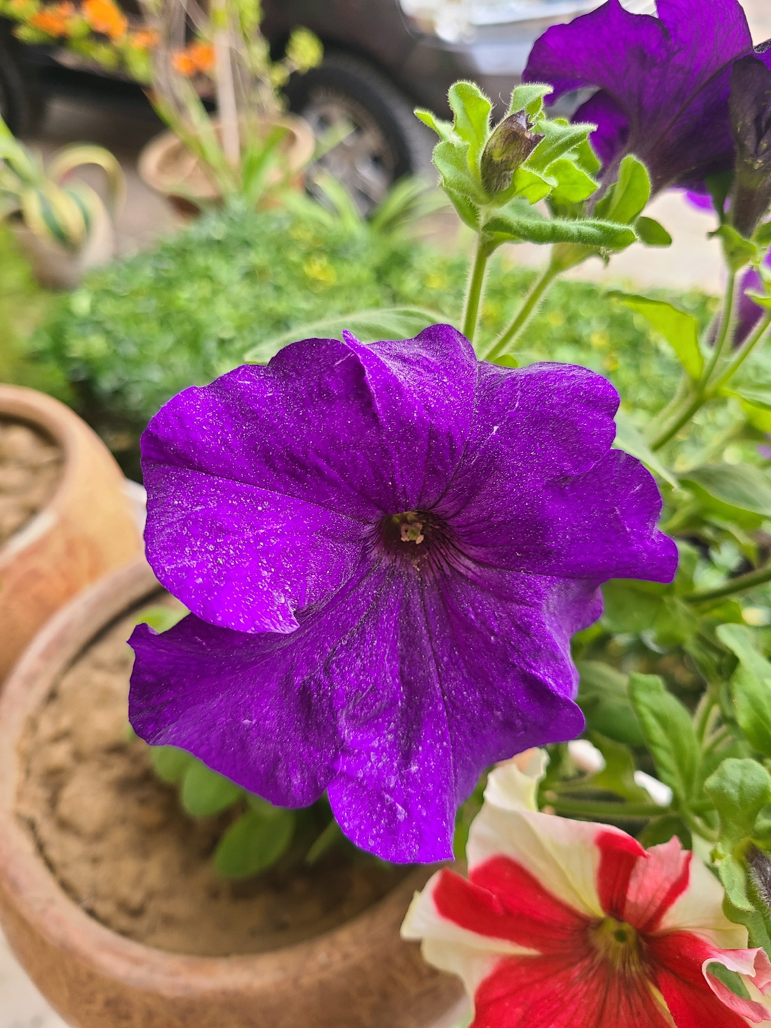 The image shows a close-up of a purple petunia flower in a terracotta pot. Other plants and flowers, including a red and white petunia, are visible in the background, which is slightly blurred. A car…read more